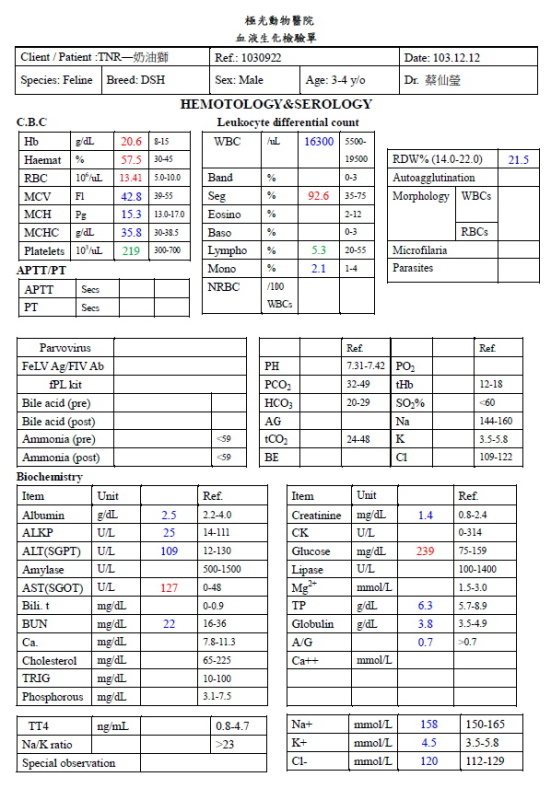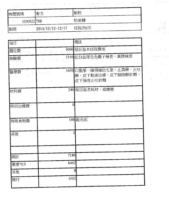 主題: 腸炎的奶油獅 申請者姓名: 臺北市支持流浪貓絕育計劃協會 花色: 申請日期: 2015-02-12 12:29:05 申請者部落格: 申請者臉書網址: 所在縣市/合作醫院: 台北市/極光動物醫院 治療費用: 6462元 需求人數: 7人 已結案 (2015-02-24 11:38:42) 報名人員: M x3(已付款)、Annier、Annier、Annier(已付款)、梁咪子(已付款)、Yamada(已付款)、友汝(已付款)、 候補人員: 動物病情說明: 奶油獅吃玩罐頭後嘔吐,第一次吐罐頭,想說會不會吃太急,15分鐘後又吐一攤,表情有點倦倦,接著狂吐,吐出的粉色的液體,緊急送往醫院進行檢查,血檢看起來狀況尚可,為保險起見先留院觀察一天,晚上奶油獅拉血狀況直轉急下,腸胃感染嚴重,給予兩種抗生素、止瀉藥、止吐藥,因為水瀉嚴重給予皮下點滴補充水分,隔天奶油獅精神依舊不好嘔吐加劇改皮下注射強效止吐針劑持續服藥給予皮下點滴,第三天奶油獅不再嘔吐但也不肯進食,靠醫師灌食雞肉泥,第四天糞便稍稍有成形,第六天狀況比較穩定先帶回安養之家繼續服藥,醫療費用還請各位幫忙。