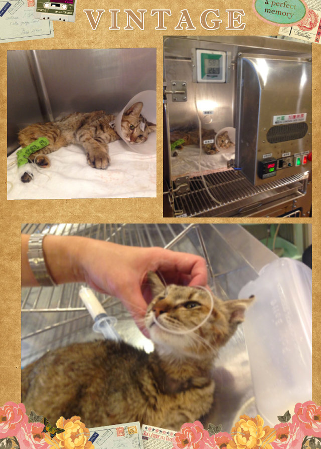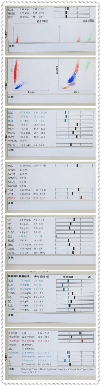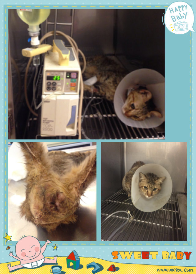 血液氣體檢查鈉離子過高, 感染造成的代謝性酸中毒, 隨即也要注意貓咪離子及代謝性和呼吸性的鹼中毒, 醫生表示目前看來有組織壞死 缺氧的狀況, 必須使用氧氣箱及保溫, 也必須監控術後的感染問題, 接下來貓咪狀況還是沒有很穩定, 一度失溫只有32.2度, 瀕臨死亡, 緊急加護病房, 並打血管