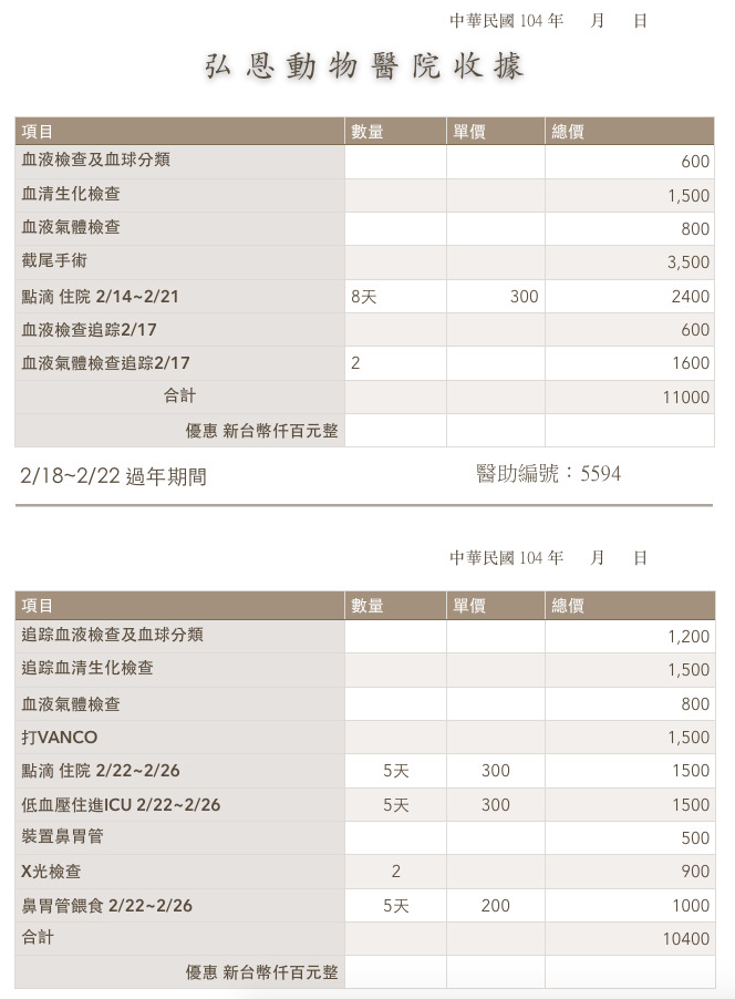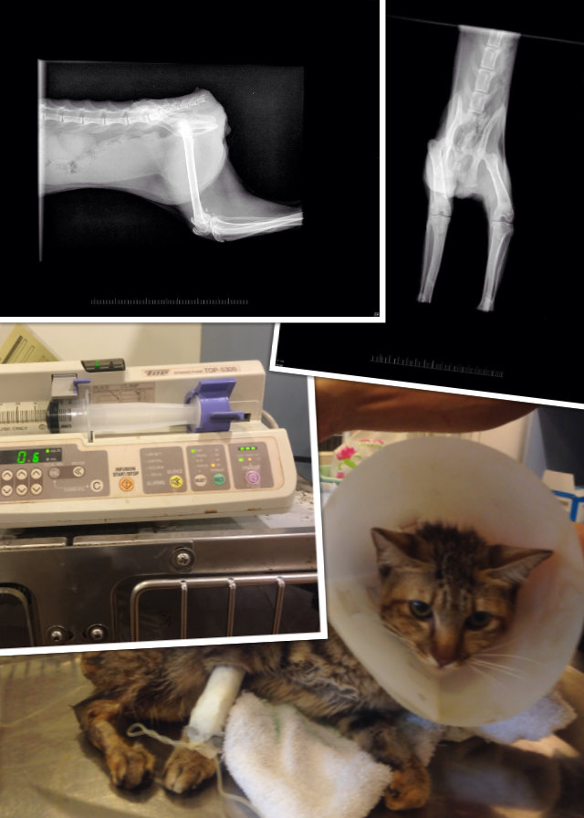 經醫生評估需要截掉尾巴, 進院後醫生也先幫貓咪檢查, 發現貓咪有貧血, 血紅素不足, 血容比不足,