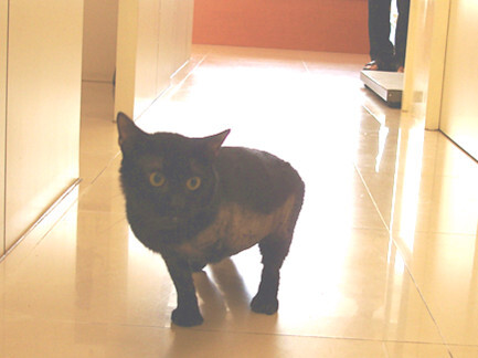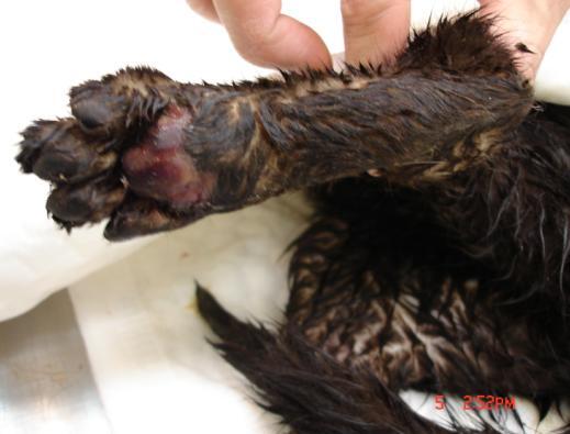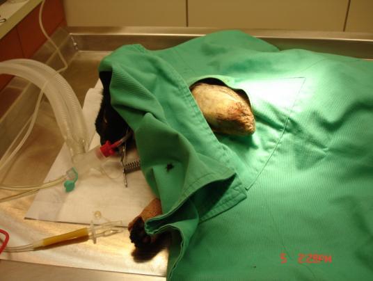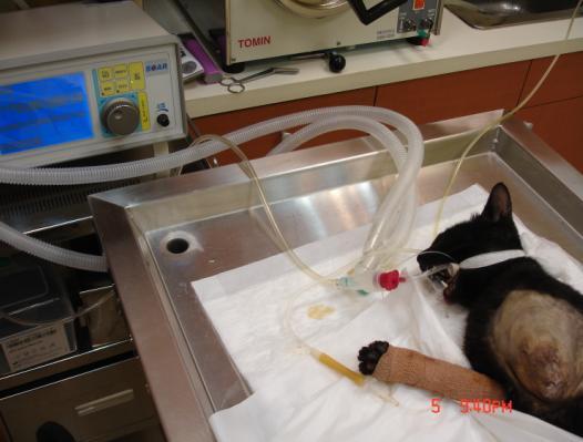 貓咪到院時非常虛弱,心跳很微弱. 而且脫水. 左後肢腳掌受傷腫脹. 左前肢疑似遭捕獸夾夾斷. 已斷掌而且腫脹敗血. 研判傷口感染嚴重腐敗且敗血,只有立即截肢才能挽救此貓生命. 因為貓咪本身虛弱. 術後一直昏迷不醒. 醫師持續給予氧氣加護治療8小時, 直到貓咪穩定呼吸,心跳後才拔呼吸管,然後移至病房休養.