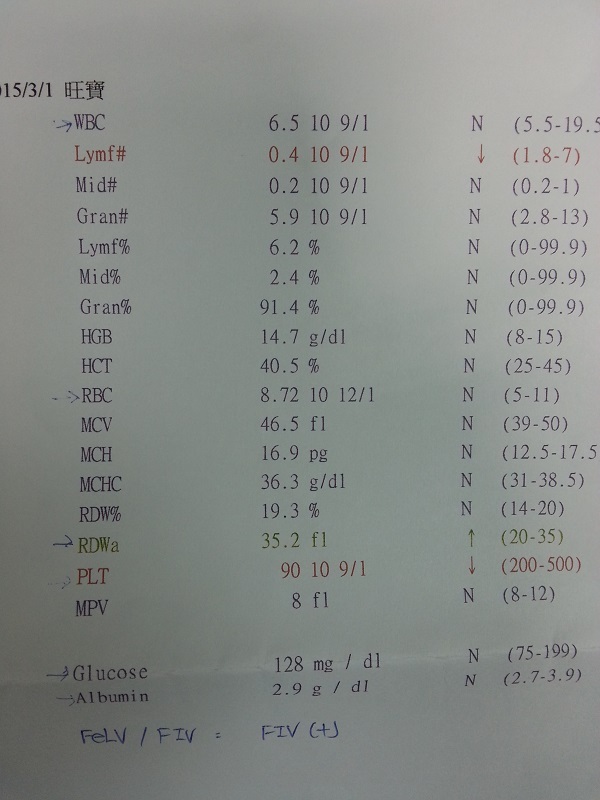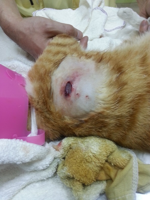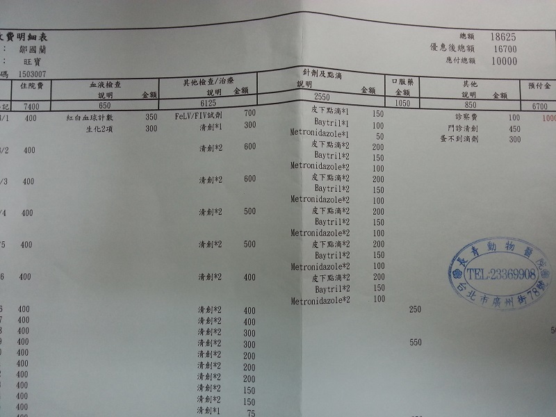 2/27晚上餵食發現牠右邊上背部有疑似咬傷或人為的一個圓形傷口. 2/28晚上抓進手提籠,3/1送長青動物醫院就醫. 旺寶右邊有個圓形極大傷口. 傷口很深一直流膿血水~ 主治蔡醫生: 看診當日有先血檢及驗愛滋和貓白血(結果驗出他是愛滋貓),傷口需要把膿血擠出,灌優碘清創及投抗生素. 需要住院治療清創傷口.治療過程中有去探望好幾次,傷口目前恢復狀況良好,3/18已接出院~