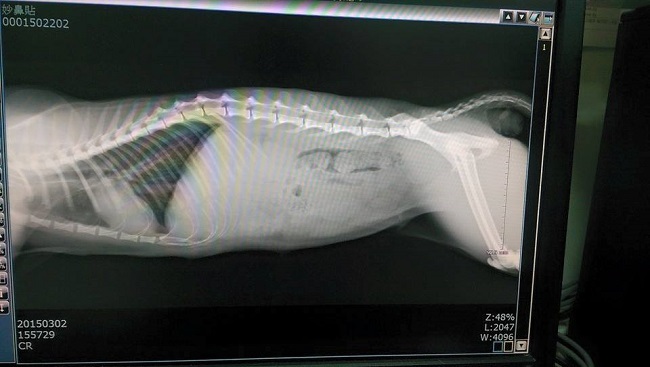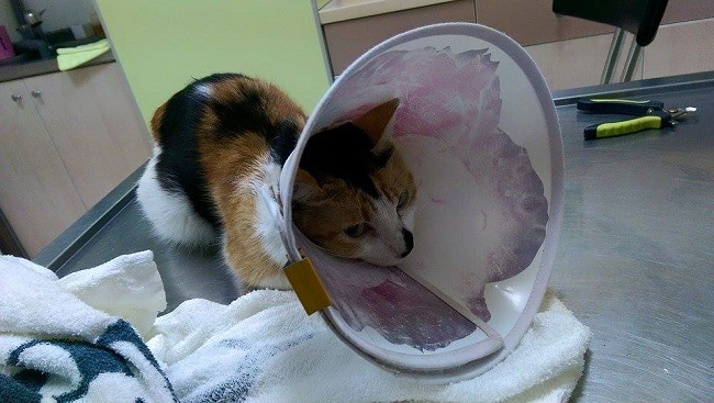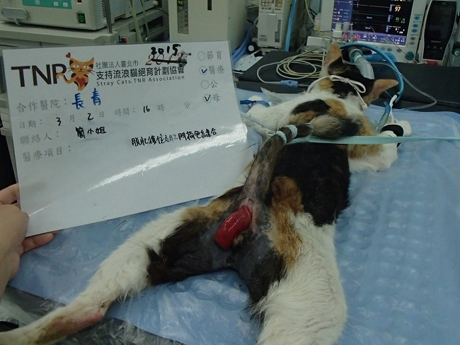 脫肛部位就又跑出來了,所以必須改由荷包往內縫法,並且在手術台時,確認這隻貓的骨盆較為鬆弛,醫生判斷是牠過往在生小孩生壞了...
