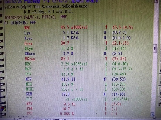原本一開始懷疑是否血巴東蟲引起的貧血,但送檢報告是陰性,並且更進一步確診為貓愛滋引起的重度貧血和血小板不足,導致再生不良性貧血+口炎..