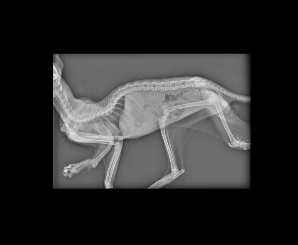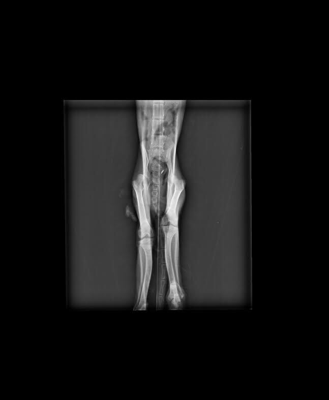 毛髮雜亂,有輕癱.血尿.虛弱.前肢脘關節脫臼.右側腸薦關節脫位 .右側髖關節脫位,