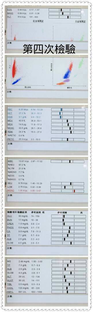 主題: 壽山收容所 術後感染併發胰臟炎的貓 申請者姓名: 劉素鳳 花色: 申請日期: 2015-03-13 01:19:34 申請者部落格: 申請者臉書網址: 所在縣市/合作醫院: 高雄市/弘恩動物醫院 治療費用: 15900元 需求人數: 18人 已結案 (2015-04-14 17:28:35) 報名人員: Ting Smile、茶茶媽咪、裴路(已付款)、白婷(已付款)、Aiko Wan(已付款)、Aiko Wan、gill x3(已付款)、阿平(已付款)、vivian(已付款)、Sarah(已付款)、徐鈺屏(已付款)、李脆脆 x2(已付款)、Wei Lin(已付款)、Cheergo(已付款)、厚(已付款)、Tiffany Cheung x3(已付款)、 候補人員: 動物病情說明: 這是收容所領出的貓咪之一,結紮部位崩開.感染,收容所沒有幫牠剪耳,醫院在重新清創時也有幫牠順便剪耳了,這之前結紮造成腹膜炎的橘貓,血檢表示白血球、嗜中性球、單核球都過高,白血球分佈圖 顕示有帶狀嗜中性球上升 表示有嚴重的急性感染,應該有腹膜炎了,必要時需清洗肚子,血清學檢查 有胰臟炎,納離子過高 感染造成的代謝性酸中毒,血中二氧化碳濃度過高 有呼吸性的鹼中毒,之後需密切的監控,有打了胰臟炎的特效藥FOY,貓咪住院期間為了掌握她的狀況,前後總共做了四次的檢驗,總覺得收容所的貓很可憐,莫名其妙被抓到收容所,還草率地被結紮,傷口沒照料好,還好被領出時發現傷口有感染,進行治療吃了一些苦頭,總算目前有個中途之家可以歇腳,感謝大家出錢出力幫助這些收容所的貓咪們 動物近況說明: 目前安置在志工家中 照顧感謝大家