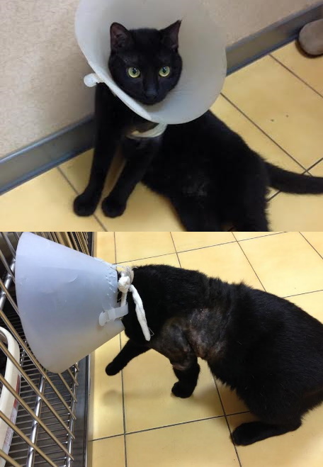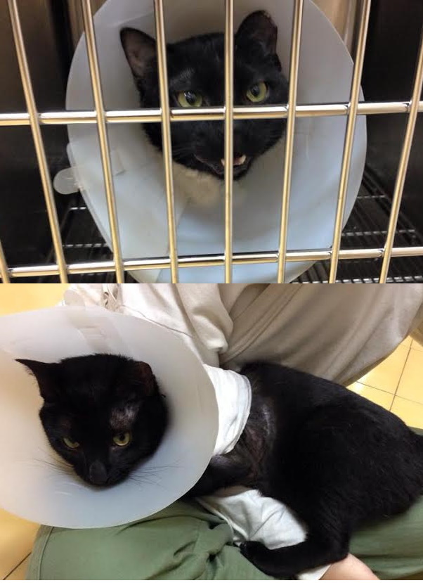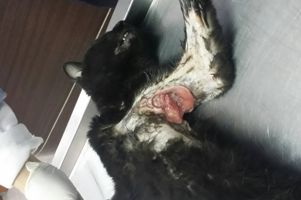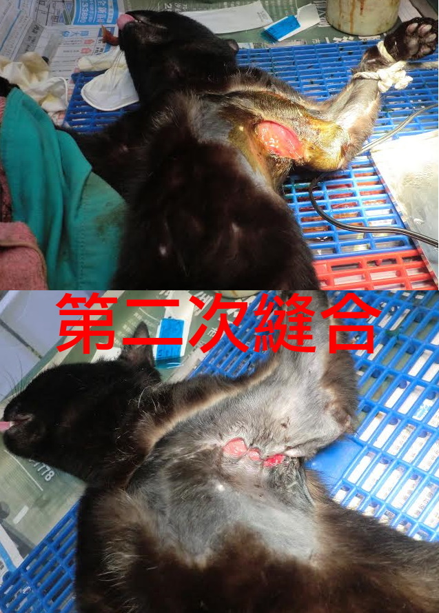 公司的人聞到有腐臭,尋味道找去,發現一隻小黑貓,腋下有傷口疑似為了爭脫項圈.前腳繞過後卻卡更緊.因此陷在肉裡(類似橡皮筋貓這樣),背部、腋下、胸前以潰爛發臭,腹部也有磨傷擦傷的點狀傷口,透過朋友得知貴協會,第一時間送往協會的配合醫院,醫師告知這個傷口需要長久治療,我可以幫忙支付部分醫療費用,送醫已經進行第一次清創縫合,每日須吃抗生素、打針消炎,換外傷的藥,每日觀察傷口變化看有沒有流濃或惡化,並且預防敗血症,背部傷口愈合情形不錯,但是腋下(約5公分)的傷口經第一次清創縫合至今尚未愈合,2015年3月31日進行第二次麻醉縫合清創,並結紮。