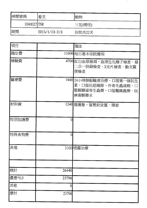 主題: 宜蘭收容所鼻氣管炎嚴重的夢露 申請者姓名: 臺北市支持流浪貓絕育計劃協會 花色: 申請日期: 2015-03-17 19:02:41 申請者部落格: 申請者臉書網址: 所在縣市/合作醫院: 台北市/極光動物醫院 治療費用: 23796元 需求人數: 25人 已結案 (2021-06-03 00:05:45) 報名人員: Sunny Chen(已付款)、Bonnie(已付款)、Daniel Tsai(已付款)、夏皮南(已付款)、Bear(已付款)、Hope Liao(已付款)、Mickey(已付款)、Cherry Huang(已付款)、dindinape、Rebecca(已付款)、Pei Jung Wu x2(已付款)、Tiffany Cheung x13(已付款)、小四(已付款)、 候補人員: 動物病情說明: