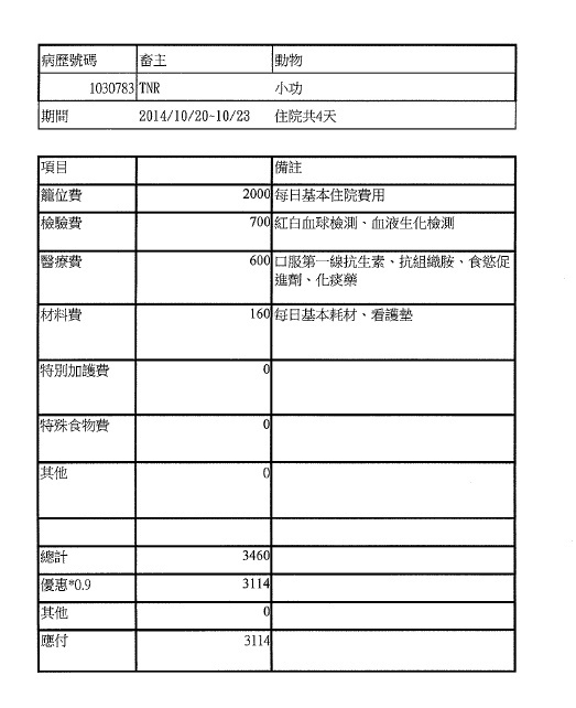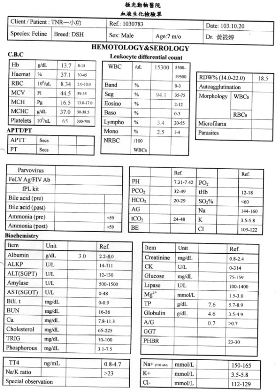 主題: 鼻氣管炎的軍功路小貓 申請者姓名: 臺北市支持流浪貓絕育計劃協會 花色: 申請日期: 2015-03-18 13:35:41 申請者部落格: 申請者臉書網址: 所在縣市/合作醫院: 台北市/極光動物醫院 治療費用: 3609元 需求人數: 8人 已結案 (2021-06-03 00:05:42) 報名人員: fotojo(已付款)、楓鈴(已付款)、徐大寶(已付款)、Amy H. T. Lin x2(已付款)、CAsperR(已付款)、詠順(已付款)、邵嵇睿(已付款)、 候補人員: 動物病情說明: 協會志工抓喵時在軍功路一處廢屋遇到餵養人,餵養人餵食廚餘給躲在廢屋裡的2隻三花喵媽媽,其中胖三花生了1隻橘白小喵(小太陽已送養)、瘦三花生了3隻小喵(小軍小功小路),小喵因環境髒亂且吃廚餘都明顯瘦弱又有鼻氣管炎,志工將母喵送醫結紮,小喵帶回協會安養之家照顧,軍功路小時候營養不好長的本來就比較瘦弱,這陣子忽冷忽熱,這幾個小朋友,開始出現食慾不振、噁心乾咳精神萎靡,送醫檢查,發燒體溫40度,有鼻塞的狀況,醫師開了抗生素並打皮下點滴後但回安養之家,早晚餵藥、噴霧治療,開又香又細緻的罐罐,而小功狀況最差張口呼吸,感覺很不舒服,醫師建議留院給與皮下點滴,住院費用還請各位幫忙。