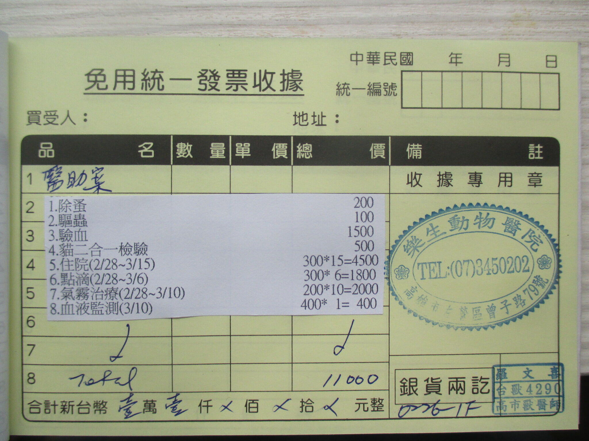 3/15小虎妹今天出院嘍,感謝樂生動物醫院醫生及助理細心照顧