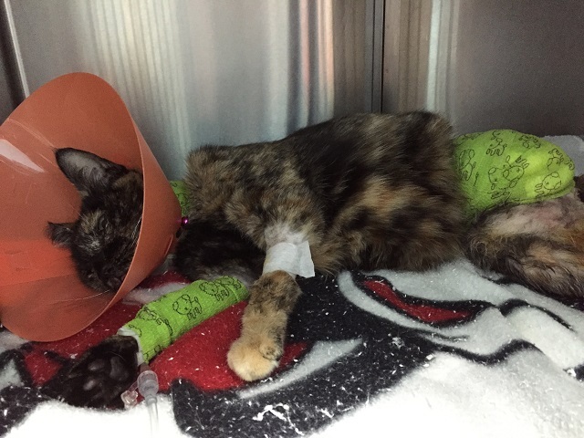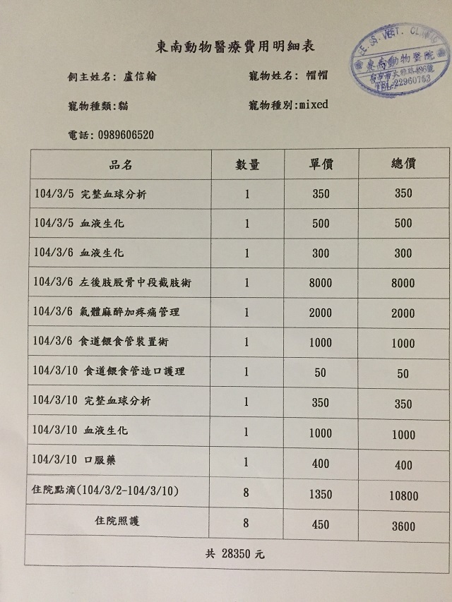 主題: 貓咪被補獸夾夾到需截肢 申請者姓名: 盧信翰 花色: 申請日期: 2015-04-02 23:22:15 申請者部落格: 申請者臉書網址: 所在縣市/合作醫院: 台中市/東南動物醫院 治療費用: 32130元 需求人數: 35人 已結案 (2021-09-03 23:51:31) 報名人員: lavinia x2(已付款)、Kafimon Chen(已付款)、Ch Huang(已付款)、Amy Huang、vivian(已付款)、Nix Lin(已付款)、Cherry Huang(已付款)、dindinape(已付款)、amency(已付款)、江清正(已付款)、卓靜 x2(已付款)、aky(已付款)、煎塔媽(已付款)、Ying-an Chen、克里斯多福羅賓(已付款)、Allen German(已付款)、歪歪(已付款)、戴戴(已付款)、邵嵇睿(已付款)、邵嵇睿、Joe Ho(已付款)、Lewis Wong x2(已付款)、Victoria Huang(已付款)、長春路四面佛(已付款)、Irene Hu(已付款)、貓寶媽(已付款)、Rean Wu(已付款)、milibear(已付款)、Emily(已付款)、斑比(已付款)、Sheryl Sung(已付款)、VICKY WU(已付款)、likeandyu(已付款)、Chen Ping(已付款)、藍格子(已付款)、 候補人員: 動物病情說明: 這隻流浪貓咪在外面流浪餵養已有1年多。2/27號凌晨12點餵完食後。2/28號那天去找她的時候就完全看不到他的蹤影。經由朋友及附近的愛心媽媽告知帽帽在2/28號晚上被捕獸夾夾到,被送至台中流浪動物中心。3/1號送去台中東南寵物醫院接受治療並觀察腳傷的情況。從3/1~3/5號滴營養針及強肝劑跟住院,血檢的資料有說到他的肝指數達到700多,而且貓咪也沒進食體力也不夠結肢,生命瀕危。就只能慢慢觀察。3/6時有在做一次血液生化檢查。肝指數有降低至108,預計下午手術開刀跟時間競賽。所幸手術順利,貓咪也恢復的跟之前差不多了。但住院及開刀、醫療費用昂貴,雖為上班族,但能出的實在有限。醫療費用還請各位幫忙。 動物近況說明: 醫生說4/3號拆完線檢查完傷口沒問題在住院1天觀察情況即可出院,貓咪出院後會帶回家中妥善照顧。現在貓咪已住在家內照顧中。謝謝各位的幫忙及善心協助。