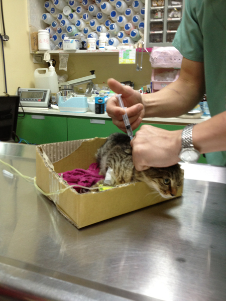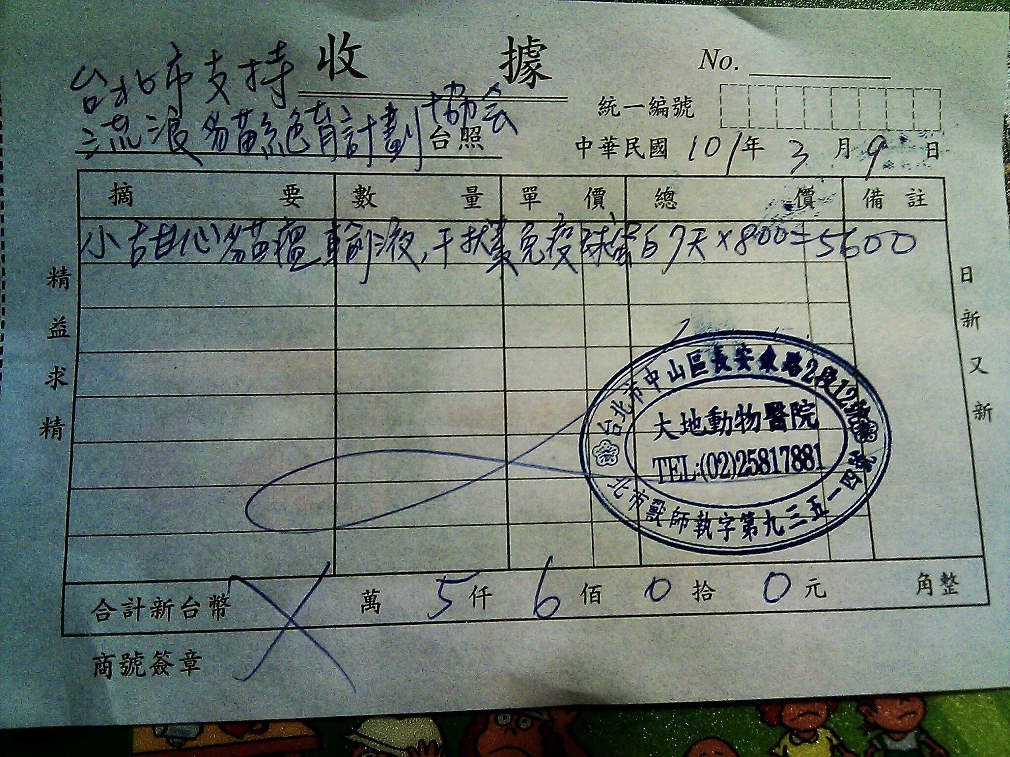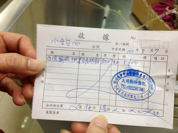 小虎斑目前在大地動物醫院住院醫療中,每日住院、打點滴及醫療費用為800元,醫生估計危險期為7天,合計危險期的醫療費用為5600元。在此先代鄭小姐和小虎斑謝謝大家的幫忙。感恩。