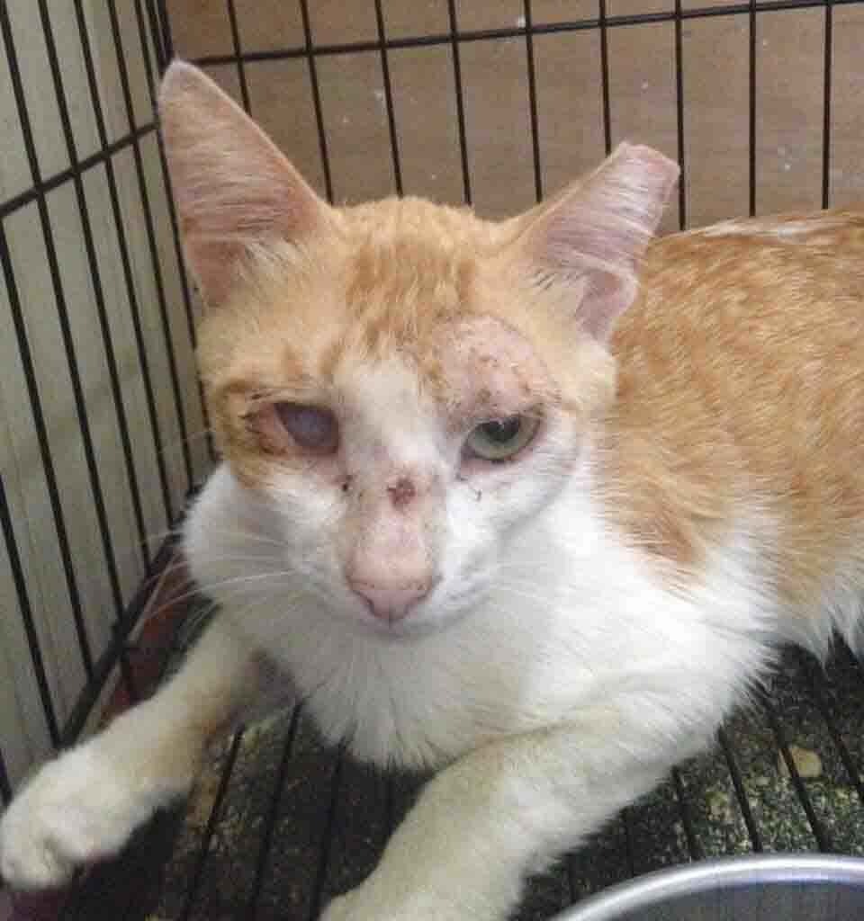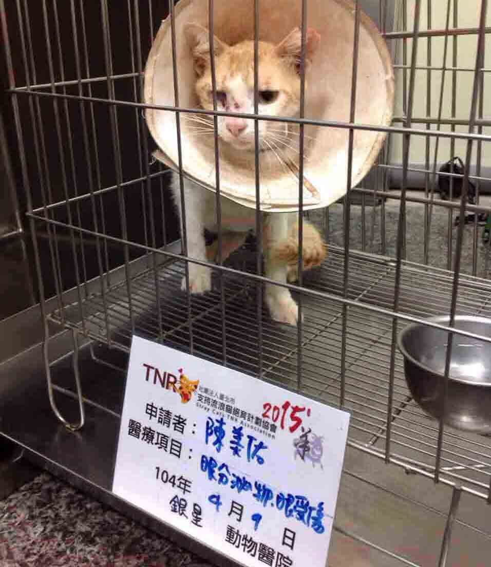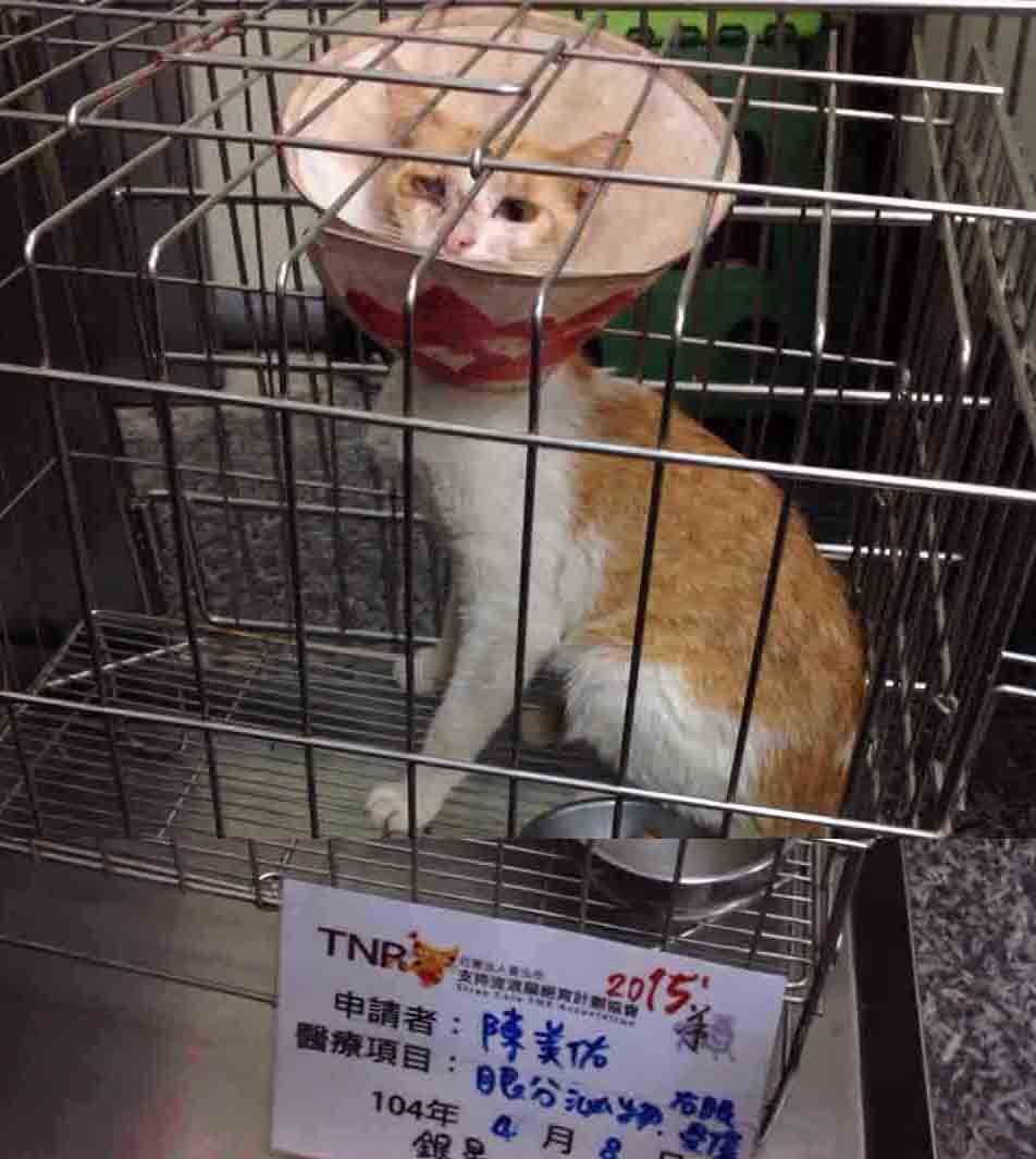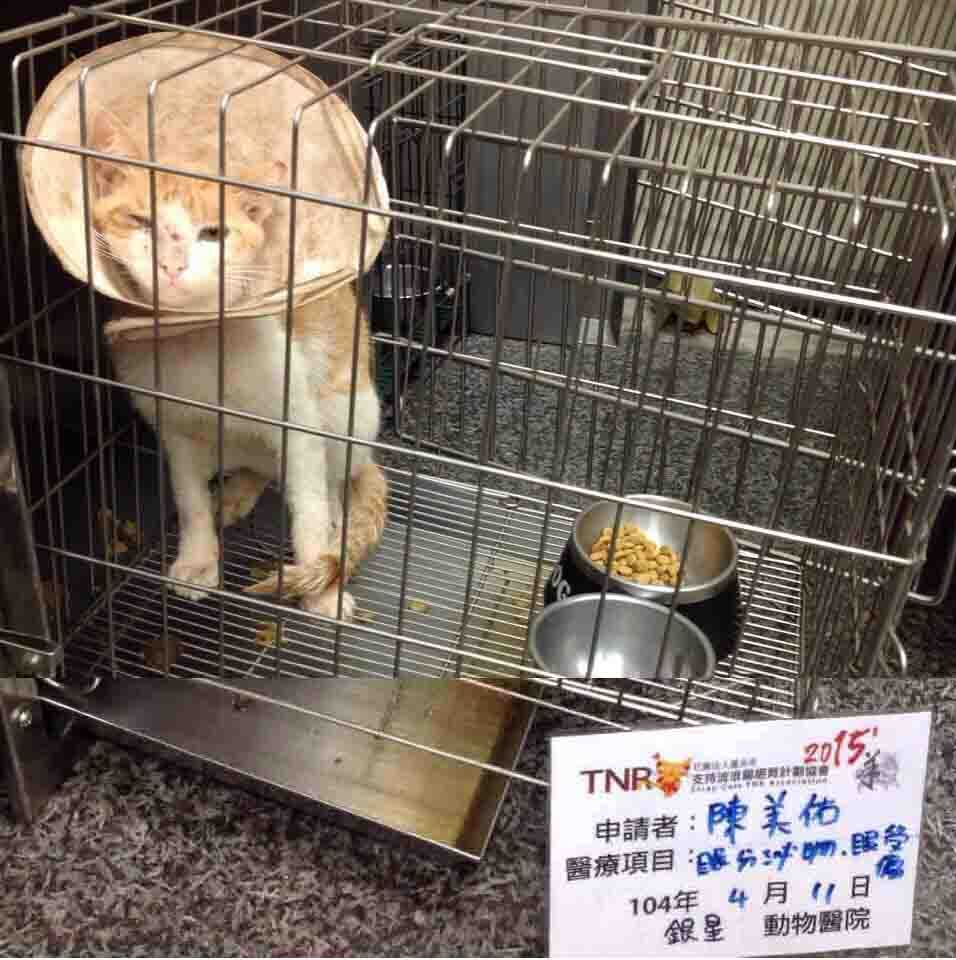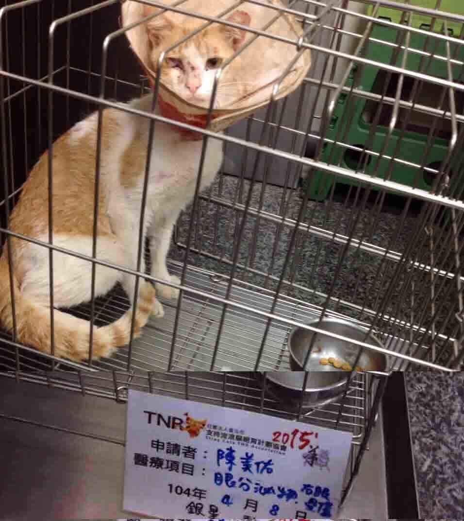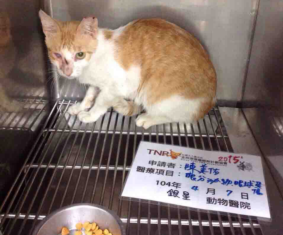 但去看貓時與醫生詢問眼球視力狀況,醫生評估貓咪此眼球的視力若未完全尚失,可能還看的到影像及距離辨視影響。因眼判牠的眼球功能可能還有,目前先以治療眼球分泌物開口服藥治療療程一週。動物近況說明: 4/13已接出院,暫留置照顧,醫院有開眼藥出院照顧用。但貓咪很兇還是沒法點藥,剛接回幾天眼分泌物已改善好了差不多了。但後幾天眼睛又有分泌物,且貓咪很兇一直抓撞籠子,撞的臉有傷痕.所以再繼續留置觀察照顧幾天,4/22觀察眼睛分泌物狀況有少了.
