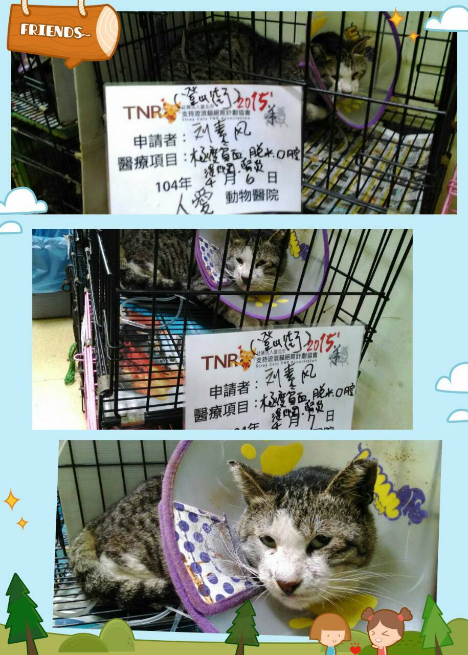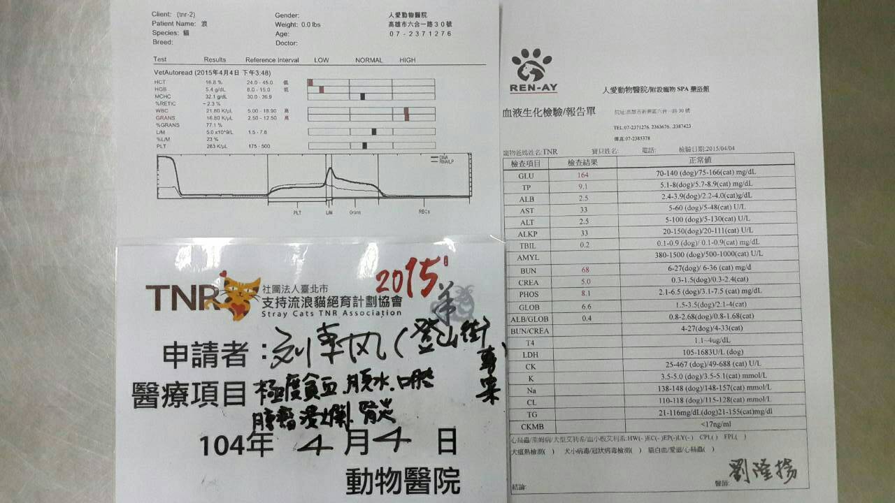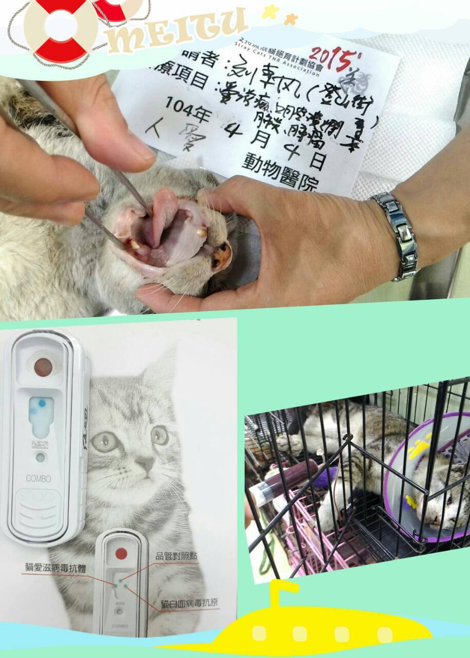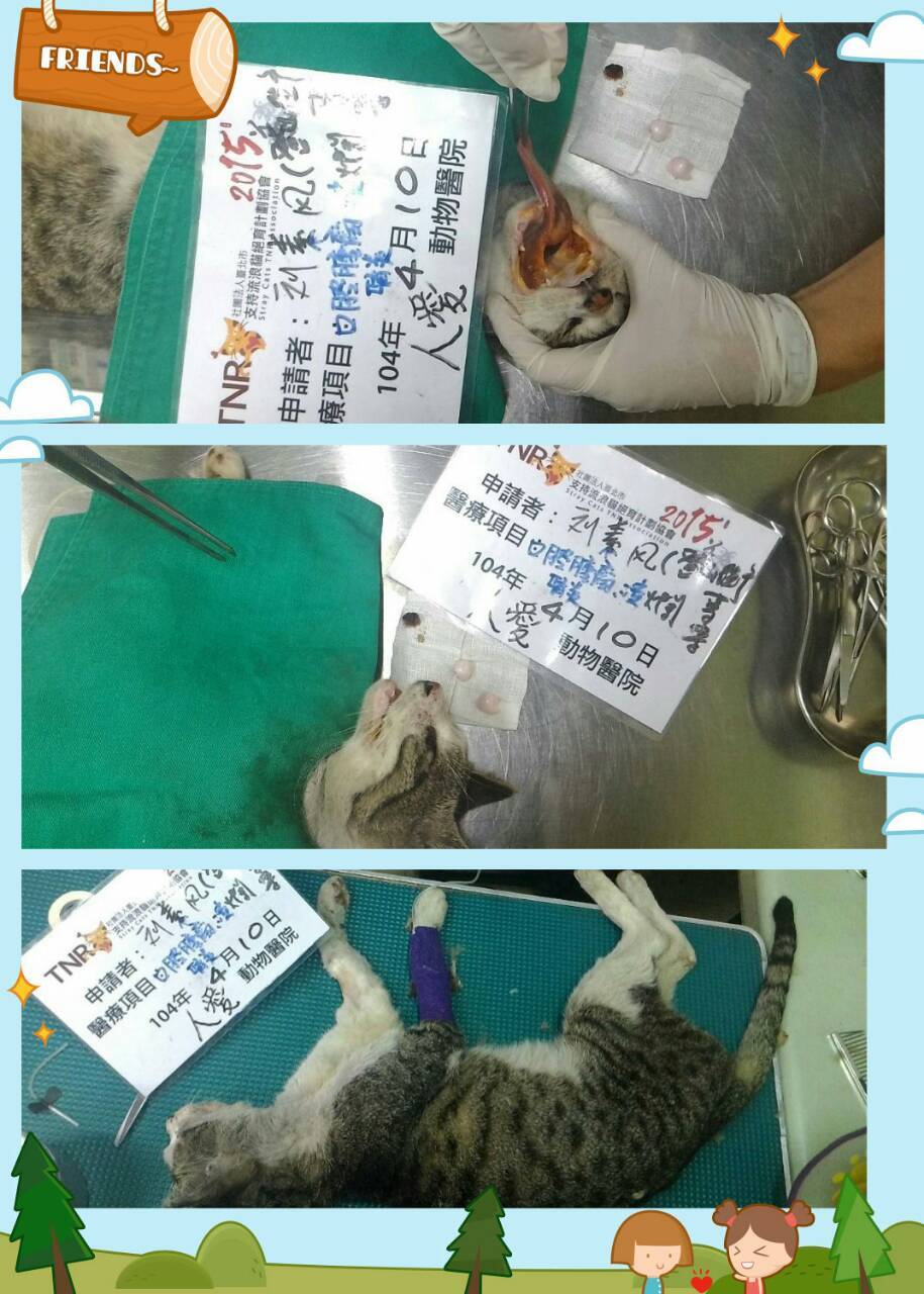 主題: 登山街的腫瘤貓 申請者姓名: 劉素鳳 花色: 申請日期: 2015-04-23 23:46:22 申請者部落格: 申請者臉書網址: 劉素鳳 所在縣市/合作醫院: 高雄市/人愛動物醫院 治療費用: 16090元 需求人數: 18人 已結案 (2022-03-11 00:07:12) 報名人員: 吳孟潔(已付款)、Sarah(已付款)、Joyce914(已付款)、Christine、Julia x5(已付款)、林米米、林米米、Vivian Chen(已付款)、Apple(已付款)、Susan x2(已付款)、Mickey Han(已付款)、Mavis(已付款)、chiahua(已付款)、小琪(已付款)、林小豬(已付款)、李佳蓉(已付款)、 候補人員: 動物病情說明: 這是志工版登山街的案件,前來抓結紮的第二趟,此貓帶至醫院結紮,結紮前醫生發現口腔粘膜較蒼白,手術中檢查口腔發現口腔 潰瘍,左右各長一顆腫瘤,是以手術過後先幫他抽血檢查,檢驗結果:嚴重貧血、極 度脫水、腎炎、白血球上升,建議需住院緊急輸血,恐有生命危險,是以需先觀察治療兩三天後若穩定再施行腫瘤切除手術。4/10醫院確認貓咪狀況ok手術摘除了口腔2邊的腫瘤,手術完順利,貓咪在醫院繼續觀察和休養,感謝醫生讓貓咪多住,4/17貓咪才離開醫院哦^^