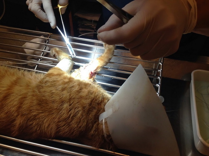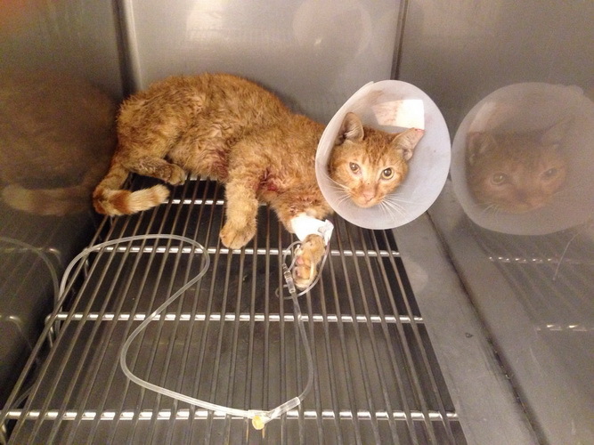 主題: 蜂窩性組織炎的橘咪將 申請者姓名: 李淑芬 花色: 申請日期: 2015-04-23 22:01:44 申請者部落格: 申請者臉書網址: 所在縣市/合作醫院: 高雄市/弘恩動物醫院 治療費用: 7000元 需求人數: 8人 已結案 (2022-03-11 00:07:09) 報名人員: Bear(已付款)、Onsra(已付款)、王千枝(已付款)、Linus(已付款)、memin(已付款)、Mickey Han(已付款)、Pei-han Liau x2(已付款)、 候補人員: 動物病情說明: 橘咪將餵養牠也快半年了,很乖,每天一定準時出現等我吃飯,已經開始在打算要抓牠結紮,卻在這時不見了,我好慌,因為他不可能不見的,約好每天見面的,怎麼會這樣,找遍了,防火巷也找了,就是找不到,就這樣10天過去了,第11天,餵完其他孩子後,準備要開始找時,我聽到牠的叫聲,聽到了,但很微弱,斷斷續續的,沿著聲音發現,原來他躲在水溝裡,光搬開那塊水溝蓋就花了我快10分鐘,搬開後他跳不出來,前腳不太對勁,於是我跑去跟小北百貨員工解了塊長木板,搭了座橋讓他走上來,原本想看看他的狀況,應該是他太痛了,一直掙扎,我只能從外觀看到他的前腳好腫,趕快拿出準備好的提籠,半抱半夾的把牠塞進籠裡,一早送醫,晚一點醫生打給我說,牠的傷口比想像中的還要深還要嚴重點,應該是被咬傷,血檢質顯示 之前有大量出血,感染很久了,聽了真是好難過,醫生已經現做麻醉清洗傷口,局部上藥,打點滴,現在只希望藥劑快點發揮最用,讓傷口能好轉別惡化,明天要帶牠平常愛吃的罐頭去給他,看牠會不會開心點