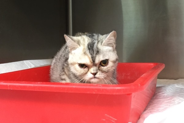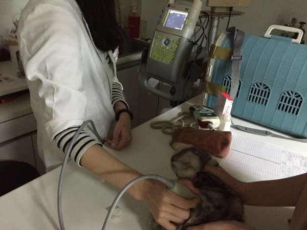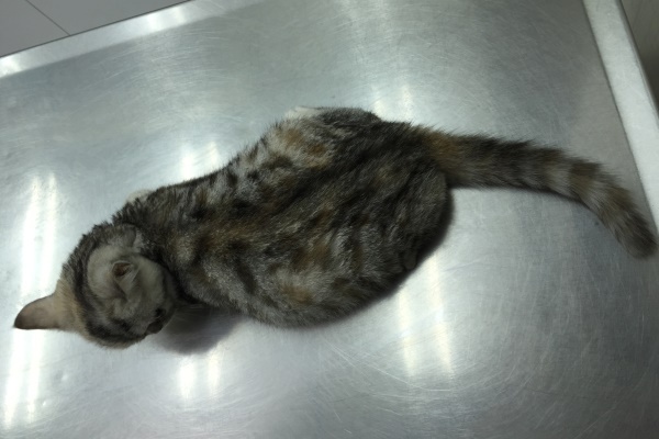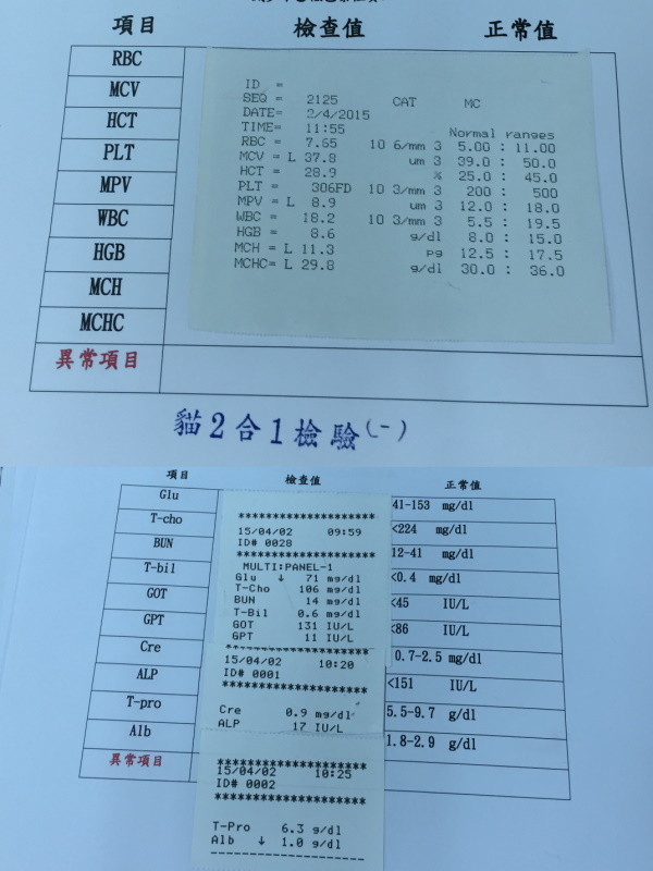 到院時小美短的體態背脊突出,腹部腫大,眼睛有分泌物,後腿無力,站立時會東倒西歪,抽血檢驗A/G比偏低,超音波掃描有腹水,醫師研判是腹膜炎的機率極大,開始給予類固醇、食慾促進劑和灌食,希望貓咪在治療下最後的日子可以開開心心的,每個人摸摸抱抱小美短都會呼嚕嚕,眼睛眨啊眨,靜靜的把頭靠在手掌中,多麼令人不捨的孩子...很遺憾在住院第四天,小美短完成她一生功課畢業了...繁殖只會造就更多的悲劇,生了病的孩子,沒有販售利用的價值就隨意丟棄,每個生命都該被好好呵護,就算是最後也該讓她在溫暖中離開,感受生命的溫暖,而不是生命的殘酷。