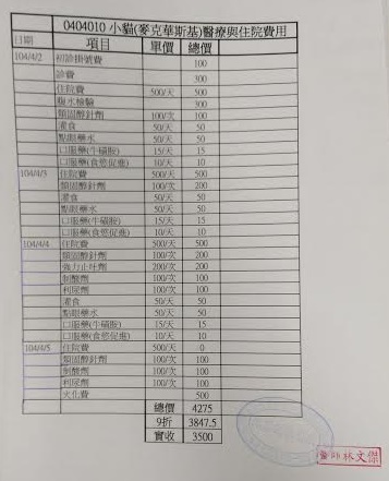 主題: 中和山上被丟棄生病的小美短 申請者姓名: 臺北市支持流浪貓絕育計劃協會 花色: 申請日期: 2015-04-11 09:19:56 申請者部落格: 申請者臉書網址: 所在縣市/合作醫院: 台北市/沐恩動物醫院 治療費用: 3500元 需求人數: 4人 已結案 (2015-04-14 17:17:59) 報名人員: Polly Ma(已付款)、Chen Tsun-Wen x2(已付款)、Satine Yang(已付款)、 候補人員: 動物病情說明: 中和山上步道上被丟棄一隻生病的小美短,帶回先安置,隔天就醫好好檢查,