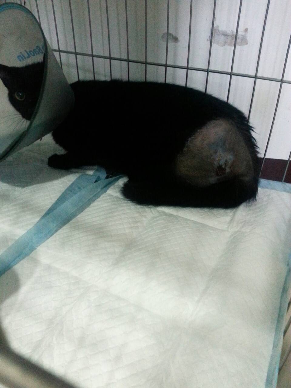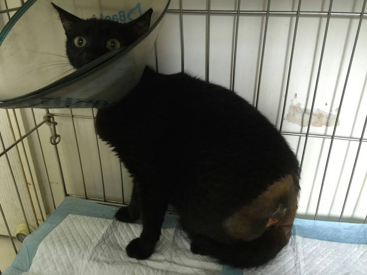 主題: 不明受傷的黑貓 申請者姓名: Shin Zhang 花色: 申請日期: 2015-05-23 14:38:15 申請者部落格: 申請者臉書網址: 所在縣市/合作醫院: 台中市/崇德動物醫院 治療費用: 6600元 需求人數: 8人 已結案 (2021-06-03 00:07:16) 報名人員: beforn(已付款)、Gina x2(已付款)、Yiching Yeh(已付款)、王雨瑄(已付款)、Annie lee(已付款)、Monica Wang x2(已付款)、 候補人員: 動物病情說明: 黑黑也是我在餵養的流浪貓,最近發現大腿上方靠近尾巴的部分有一塊傷口,看起來很嚇人,誘捕了幾天總算抓到。醫生進行外傷處理,說有一點感染,也需要住院持續治療,希望他快點好起來。