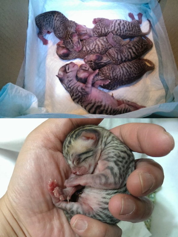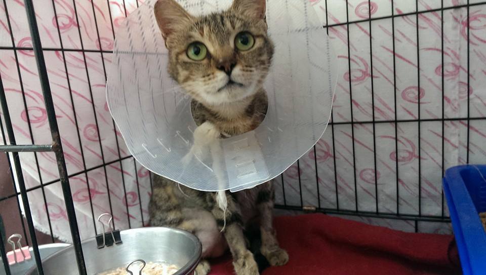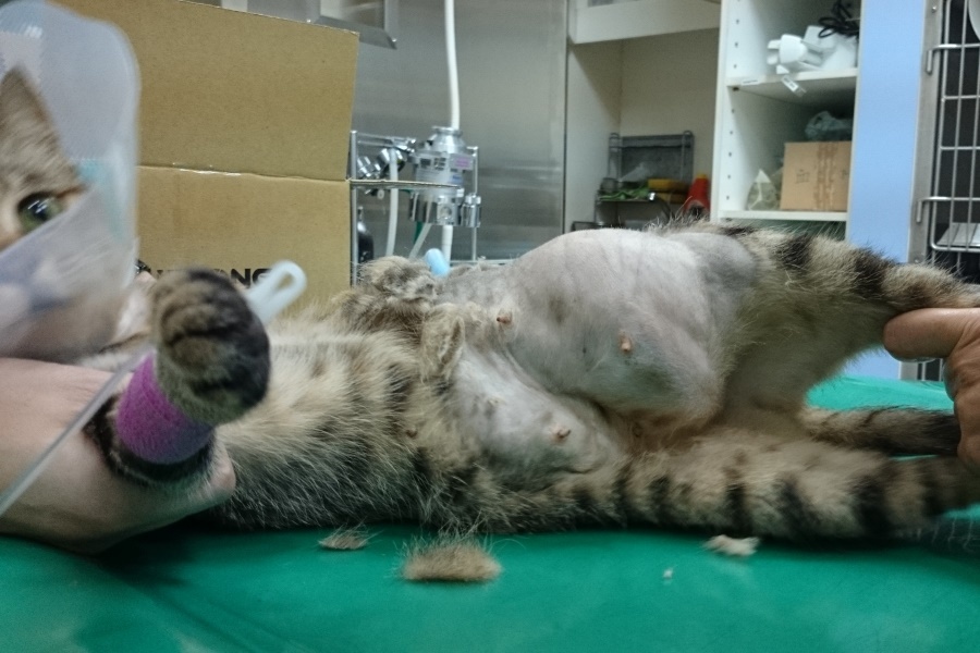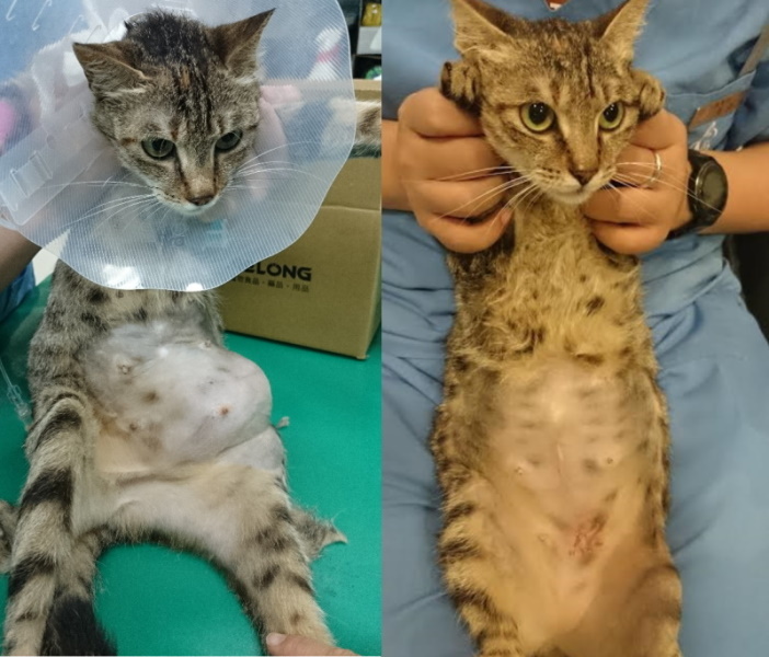 志工前去救援,發現貓咪非常親人,抱進外出籠送醫檢查,x光檢查發現腹腔赫尼亞,胎兒隨著破洞掉到後腳,當天血檢白血球過高,恐怕已經有感染的狀況,萬一引發腹膜炎,會危及母子的性命,緊急安排手術,腹中的胎兒只能盡力保全,希望母貓能平安,隔日手術縫合腹腔破洞,並將小孩取出,共有六隻,因為由腹腔掉出,有兩三隻小貓活動力較差,母貓清醒後因為腹腔壓力改變,感到非常不舒服,也有可能因為沒有生產的過程,他不願意接近小貓,一看到人就倒地討摸摸的她,拒絕小貓靠近,也不願意哺乳,醫師緊急通知由志工帶回人工餵奶,每隻小奶貓都比正常奶貓小了三之一,活動力較差懶洋洋的,志工每三十分鐘一兩滴奶水餵養,慢慢的其中三隻小貓越來越有活力,但另外三個小朋友飛走了,我們都盡力了,也謝謝志工幫忙找尋已經哺乳結束的貓媽媽,經過檢驗隔離確認身體狀況良好,擔任起三小貓的哺乳的重責大任,玳瑁媽媽雖然有點小緊張,疑惑的看著小奶貓,夜深人靜,充滿愛心的她開始認真當起奶媽的角色...