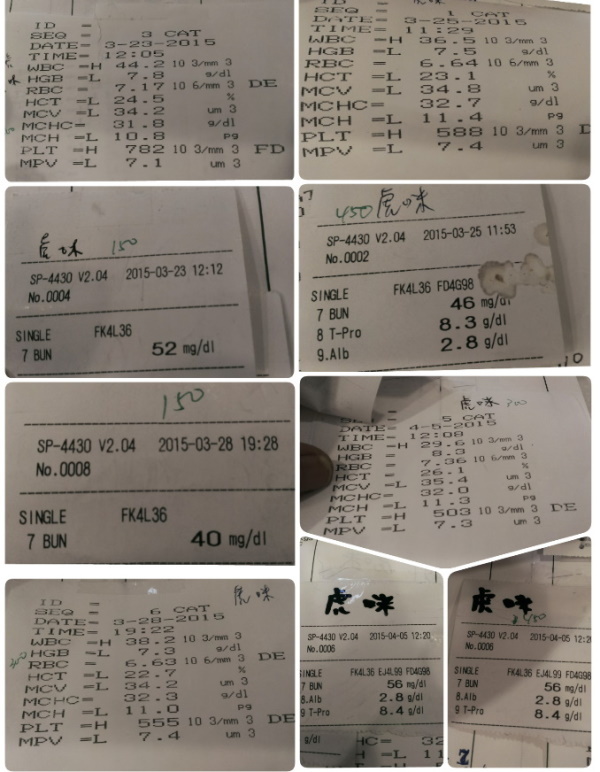 3/28白血球更往下降,精神較好,貧血嚴重,腎指數下降,加強補血