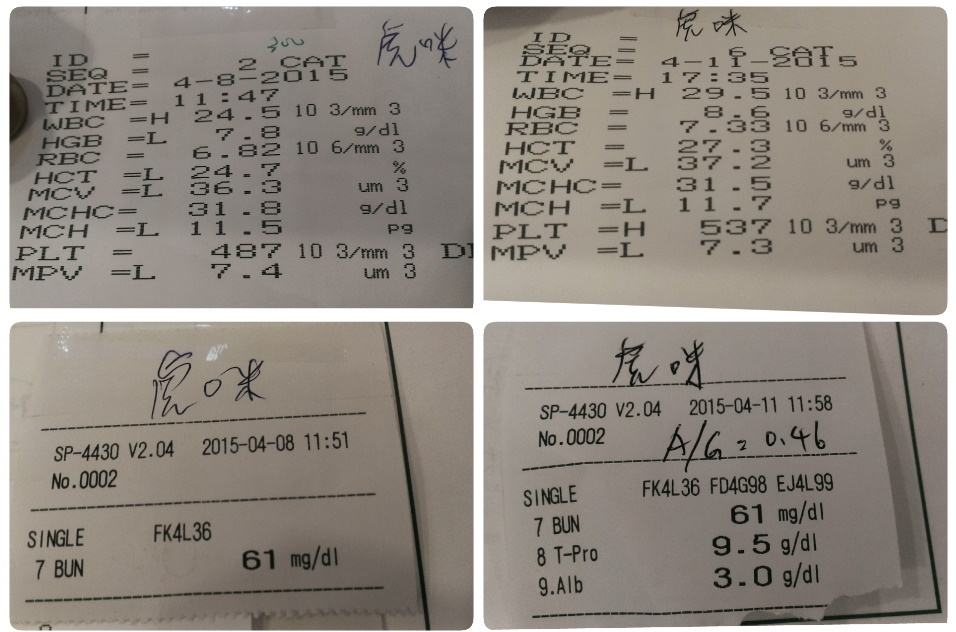 主題: 路倒貓 申請者姓名: 潘怡璇 花色: 申請日期: 2015-05-11 07:52:39 申請者部落格: 申請者臉書網址: https://www.facebook.com/profile.php?id=100000369575090&__nodl 所在縣市/合作醫院: 台北市/紀劃動物醫院 治療費用: 27480元 需求人數: 30人 已結案 (2022-03-11 00:09:07) 報名人員: Colamiz Mizcat(已付款)、annawu(已付款)、陳皮梅(已付款)、Ciara Ting(已付款)、周咪寶(已付款)、妞咪(已付款)、慢慢(已付款)、小米(已付款)、曹小文 x2(已付款)、chlh(已付款)、Shih-wen Huang(已付款)、Bear(已付款)、Yixiun(已付款)、Renee Ch(已付款)、Mickey Han(已付款)、黃小晴(已付款)、Tiffany Shen x2(已付款)、曹小文(已付款)、小可(已付款)、張雅筑(已付款)、chiawei(已付款)、千娌(已付款)、Yu-Chieh Tsai(已付款)、ERic YU(已付款)、Pstar Huang(已付款)、SASA(已付款)、lsf330 x2(已付款)、 候補人員: 動物病情說明: 日前救援一隻路倒貓,送醫後檢查出黃疸,貧血,脫水,營養不良,重感冒,口炎,讓貓咪在醫院調養,治療約一個月後,醫師評估也可出院待養胖之後再回來結紮,送中途住一個月已準備要回醫院檢查健康狀況後結紮R回,中途觀察吃,喝,尿量都正常情況下,體重應該要胖卻一直沒增加,此時醫師從她身體狀況推測應是冠狀病毒作怪,當下醫師已作隔離,給予抗生素,藥物治療及黃金黑酵母,褐藻糖膠以增強免疫力,且已送檢驗所檢驗,日前醫師來電已驗出為冠狀病毒陽性,並從她目前身體狀況及血檢數值,A/G比,淋巴球數值推測可能為乾性腹膜炎,腎指數,貧血,白血球過高的狀況都還在治療當中。3/23白血球上升至4萬44,給予口服抗生素
