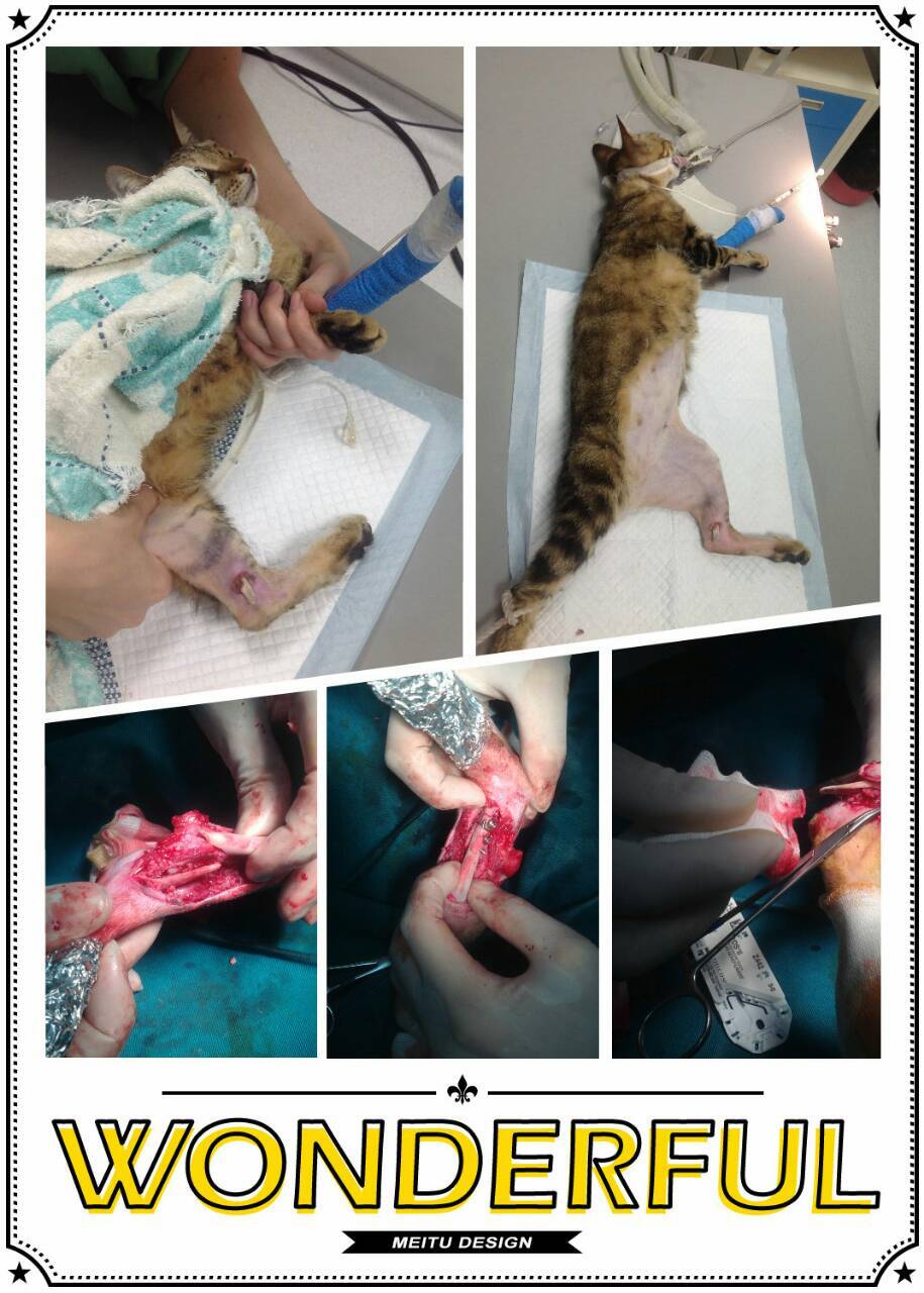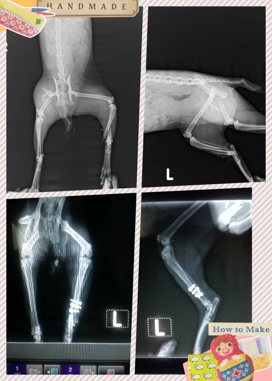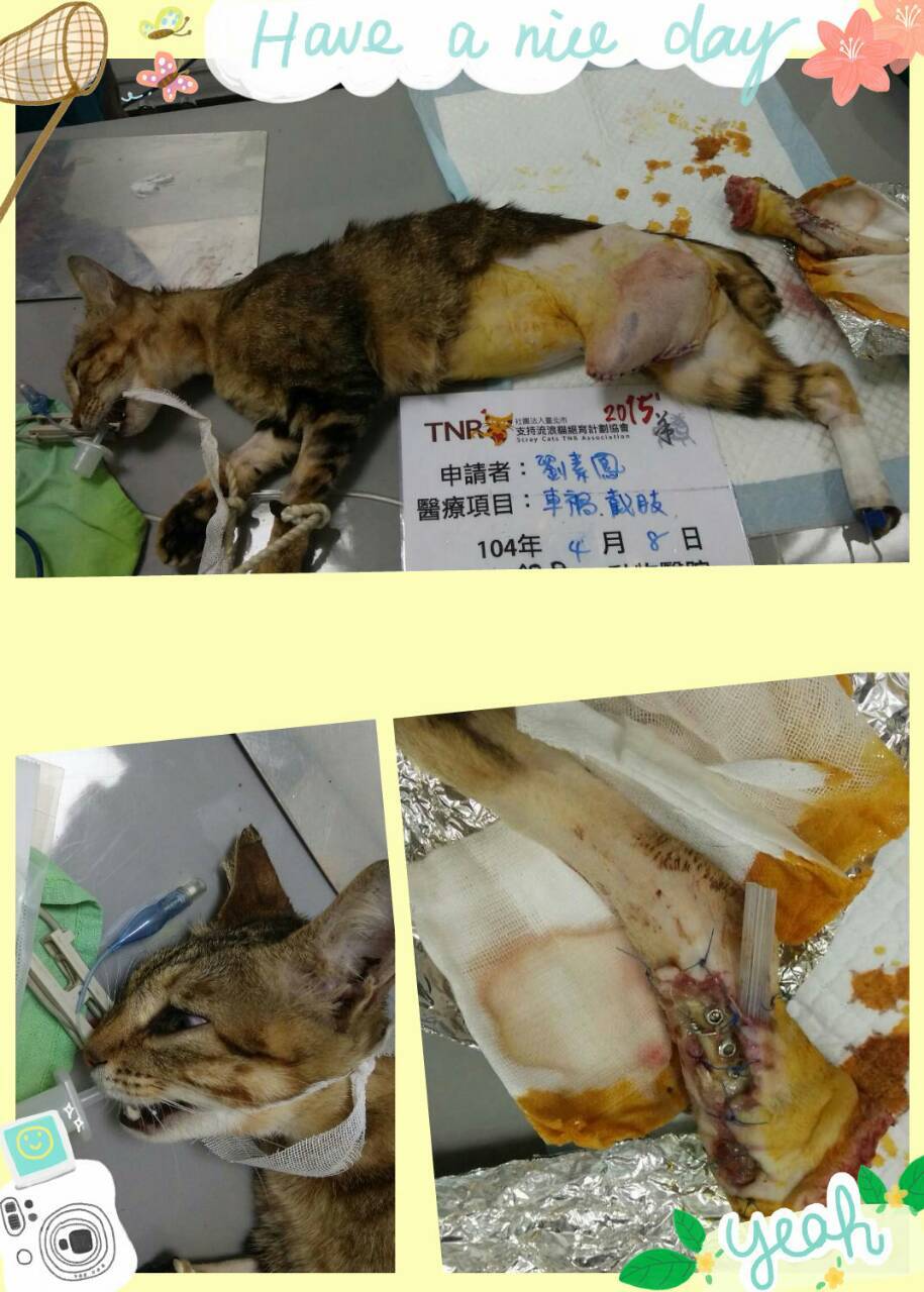 由於之前左後肢開放性骨折傷口,手術後傷口有感染狀況,有再清創過一次,但感染情況沒有控制住,於是決定於進行截肢手術,避免傷口向上感染,後來傷口狀況穩定。最後傷口剩下一小塊肉芽組織還沒癒合,其他傷口接癒合好,食慾精神都正常,右腳已可使用,後來停止針劑,只有口服藥跟清創抹藥,再修養一些時間準備出院。