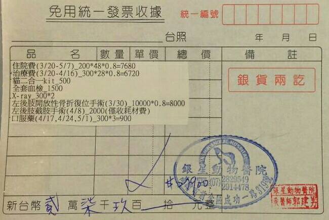 主題: 民族路的車禍癱瘓貓 申請者姓名: 劉素鳳 花色: 申請日期: 2015-05-15 16:47:38 申請者部落格: 申請者臉書網址: 劉素鳳 所在縣市/合作醫院: 高雄市/銀星動物醫院 治療費用: 27900元 需求人數: 30人 已結案 (2022-03-11 00:09:04) 報名人員: Nil Lin(已付款)、陳薏絜(已付款)、Jolie(已付款)、竹君(已付款)、Kenix(已付款)、Cathy Chang(已付款)、張瑞芬 x2(已付款)、vivian(已付款)、vita yang(已付款)、張恩綺(已付款)、林俞彤(已付款)、PhoebeWang(已付款)、Alison Lee(已付款)、家有三色喵(已付款)、Haru chen(已付款)、櫻花妹(已付款)、Alice(已付款)、Alice(已付款)、annlin(已付款)、Rocky Chen x2(已付款)、Egg Sh(已付款)、坤仔、坤仔(已付款)、史蒂芬(已付款)、阿偉(已付款)、張雅筑(已付款)、孟星魂 x2(已付款)、Felina Liu(已付款)、Ying-chen Chiu(已付款)、 候補人員: 動物病情說明: 這是行經六合夜市旁的民族路邊看到的疑似車禍貓,後兩腳拖行,送醫檢查貓咪後兩腳是粉脆性骨折,神經還有反應,治療希望腳有復原的機會。一開始進院貓咪狀況沒有很穩定,且有發燒的狀況,骨折處傷口感染,所以先穩定貓咪狀況,接下來等狀況較穩定,先處理開放性骨折的患肢,右腳雖還沒手術但已可以活動,有希望能逐漸恢復活動力,故先暫緩手術。