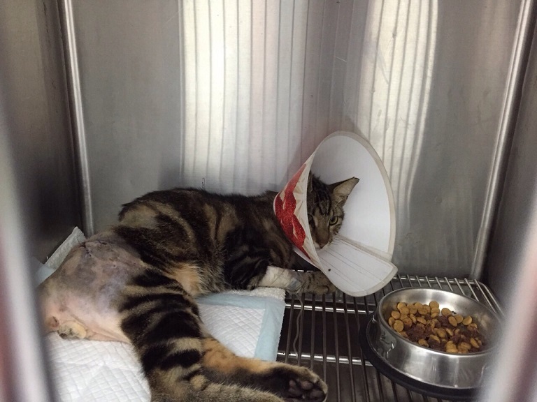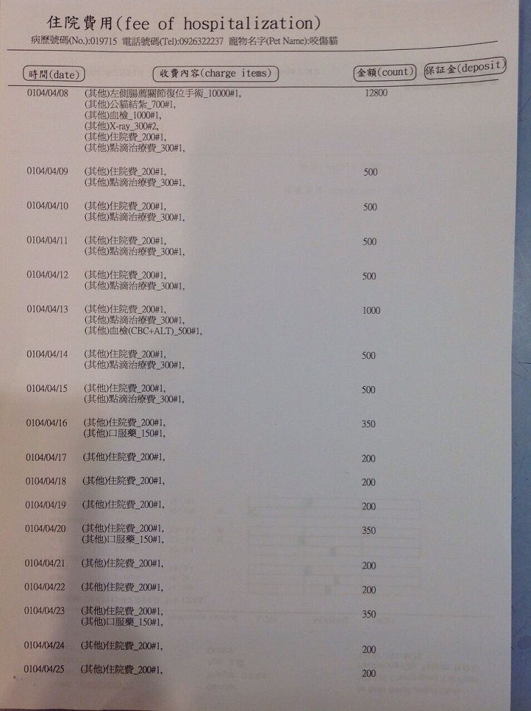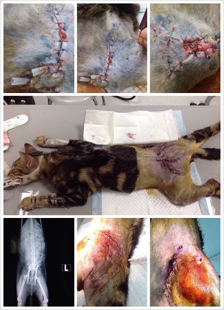 主題: 被狗咬傷的美短虎斑 申請者姓名: 歐陽妃 花色: 申請日期: 2015-05-30 12:43:27 申請者部落格: 申請者臉書網址: 所在縣市/合作醫院: 高雄市/銀星動物醫院 治療費用: 27500元 需求人數: 29人 已結案 (2021-09-03 23:52:15) 報名人員: Shizuka Ho(已付款)、orange(已付款)、玉米(已付款)、misselaine(已付款)、ying x2(已付款)、Peishan Lee x2(已付款)、何偉靖(已付款)、vivian(已付款)、Nadia Huang x5(已付款)、Joe Chen(已付款)、彥霈、韋魚 x2、Trista Kao(已付款)、sonwing(已付款)、盧延毫(已付款)、Vicky Chang Shyr x2(已付款)、juan(已付款)、逗號洋行 x4(已付款)、lavinia x3(已付款)、 候補人員: 動物病情說明: 小貓被大狗攻擊咬傷甩傷,被發現時已經倒臥不起,無法逃離!左後大腿出血不止,緊急送醫,到院時經醫師X光照射得知除了嚴重咬傷造成感染撕裂傷外甩咬造成左大腿的腸薦關節脫臼,必須手術復位固定縫合、因為小貓本是浪貓瘦小營養不量,命在旦夕!故申請醫助救他一命 動物近況說明: 受傷貓吉平傷口大至已經完全康復只有腸薦骨突出地方大約2∼3公分摩擦破皮的傷口還需上藥,可以行走,後腿也有力量,但住院期間關籠,無法確定它是否可以跳躍,但是因為大狗咬傷傷及骨盆裡的自行排尿神經,目前還是無法自行解尿,必須要人工幫忙ㄧ天擠尿2∼3次,醫院通知在5月29日已經接回至領養人李彥霈小姐照顧跟教導如何協助貓咪擠尿方法,吉平貓咪食慾正常對人還不是那麼親人但是領養人會用心照顧出院的它,希望它排尿神經可以慢慢恢復正常,重新再回健康正常的貓咪生活!