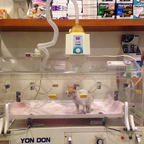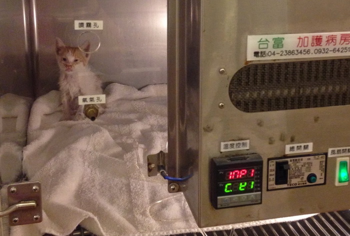 4月23日今天去探望小白黃和小黃白,他們在保溫箱裡持續做超音波噴霧呼吸道治療,小白黃的活動力比昨天好些,會吃一點幼貓泥