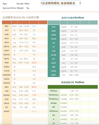 4月22日當天早上立刻送醫, 醫生說小白黃左眼眼球萎縮,右眼則是整個眼球爆出,就確定雙眼失明了,到會做眼球摘除手術,晚點醫生有打給我說,小白黃有全身急性敗血症的情形,小白黃的狀況不是很好,要有心理準備,而小黃白也一樣有嚴重貧血,白血球及單核球超高,帶狀嗜中性球也超高,也有全身急性敗血症情形
