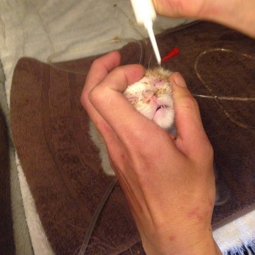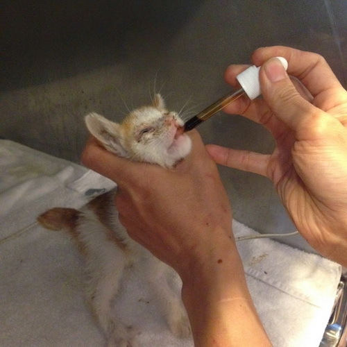 4月27日小黃白因還很虛弱,依然還需灌食,且眼睛部分還有些許感染狀況,所以決定再多住院一星期