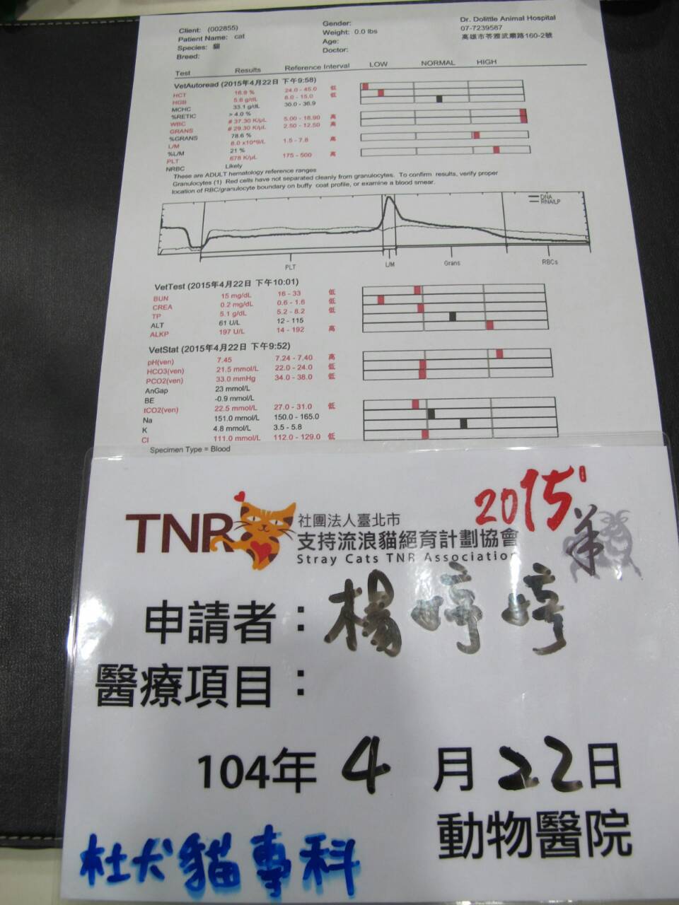 主題: 後腳無力嚴重貧血+脫水的小貓 申請者姓名: 楊婷婷 花色: 申請日期: 2015-05-03 23:11:02 申請者部落格: 申請者臉書網址: 所在縣市/合作醫院: 高雄市/恩澤動物醫院 治療費用: 8060元 需求人數: 9人 已結案 (2021-09-03 23:52:06) 報名人員: Bella(已付款)、Kelly(已付款)、豆豆媽(已付款)、Lewis Jessica(已付款)、豆豆媽、豆豆媽、Nicole Chen(已付款)、楊小兔(已付款)、楊苺苺(已付款)、Fidji Chen(已付款)、sbjenny(已付款)、 候補人員: 動物病情說明: 4/22下午在店門口撿到這隻小賓士,