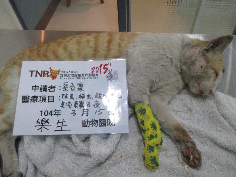 主題: 上呼吸道嚴重~脫水~貧血~嚴重白血球偏低的愛滋貓 申請者姓名: 蔡奇霖 花色: 申請日期: 2015-04-25 20:14:03 申請者部落格: 申請者臉書網址: 所在縣市/合作醫院: 高雄市/樂生動物醫院 治療費用: 13700元 需求人數: 15人 已結案 (2022-03-11 00:09:00) 報名人員: Frankie(已付款)、魚茜(已付款)、Jj Shee(已付款)、yenshi(已付款)、劉骨骨、Kira Liou、Kira、Rebecca Chen(已付款)、Roxy Hu(已付款)、Joy、Joy(已付款)、Yuusetsu Chung(已付款)、陳哈君(已付款)、阿吉(已付款)、Cathy Wang(已付款)、Amber Chung(已付款)、CrystalBall x2(已付款)、Rou Hui Wu(已付款)、 候補人員: 動物病情說明: 這隻橘白貓是最近新出現在我的餵養區得貓~~發現時知道有感冒很嚴重~連呼吸都有聲音~也很瘦~臉上也有傷口~~有先投藥試看看~但可能出現的時間跟我沒辦法搭上~所以在投藥的狀況下效果不是很好~