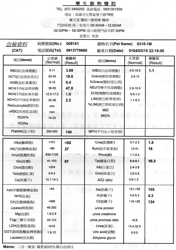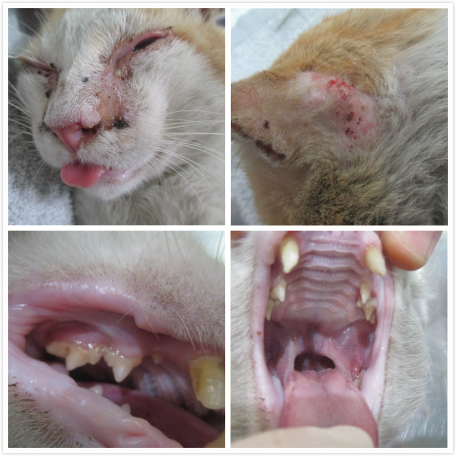 有脫水,打噴嚏,鼻膿及眼分泌物等鼻氣管炎症狀,初步驗血有貧血,嚴重白血球偏低現象且有貓愛滋,初步先給予輸液治療,針劑及氣霧治療,治療幾天後會再做抽血檢驗