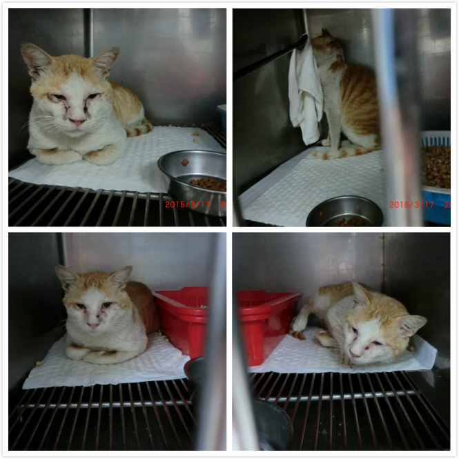 3/20去醫院看橘貓~眼睛眼屎看來好多了~~上呼吸道也沒剛開始的的有聲音了~~雖然還不能直接用手拿毛巾擦拭眼屎~~但至少有比前三天在好多了~也更比剛進去時好~比較不會兇了~等狀況再好會再進行結育手術~~也吃喝目前都正常喔~