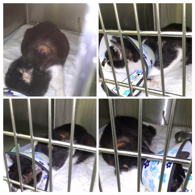 我第一次看到她就被她背上的傷嚇一跳,看起來血淋淋,以為是燙湯,結果不是燙傷,包紮治療並隔離一陣子後,傷口有癒合,不過新生的皮膚很脆弱,貓咪會去磨蹭,導致背上的傷口時好時壞,冬天比較乾燥,癒合情況較好,夏天潮濕傷口會變得嚴重,一直都有持續拿藥擦跟噴消炎粉。