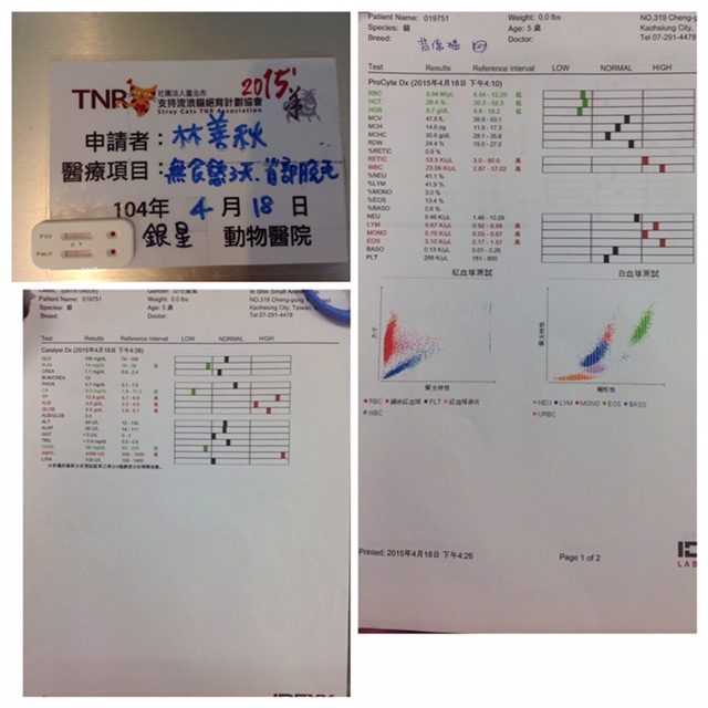 血檢報告發現胖達有貧血與體內發炎現象,有貓愛滋,醫生說有可能是愛滋發作抵抗力下降導致發炎,影響食慾。胰臟指數一個正常一個偏高,要再觀察,目前無法確定是否為胰臟炎,先控制發炎狀況恢復食慾為第一目標。
