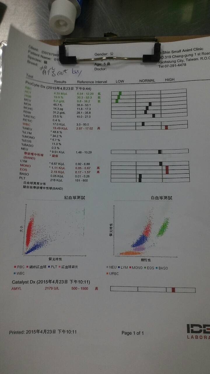 23日抽血檢查,發現貧血狀況變嚴重,可能是因為第一次驗血時有幾天沒吃,脫水使得貧血有誤差,至於胰臟指數有好轉,食慾也不錯,帶罐頭去加菜也都有吃