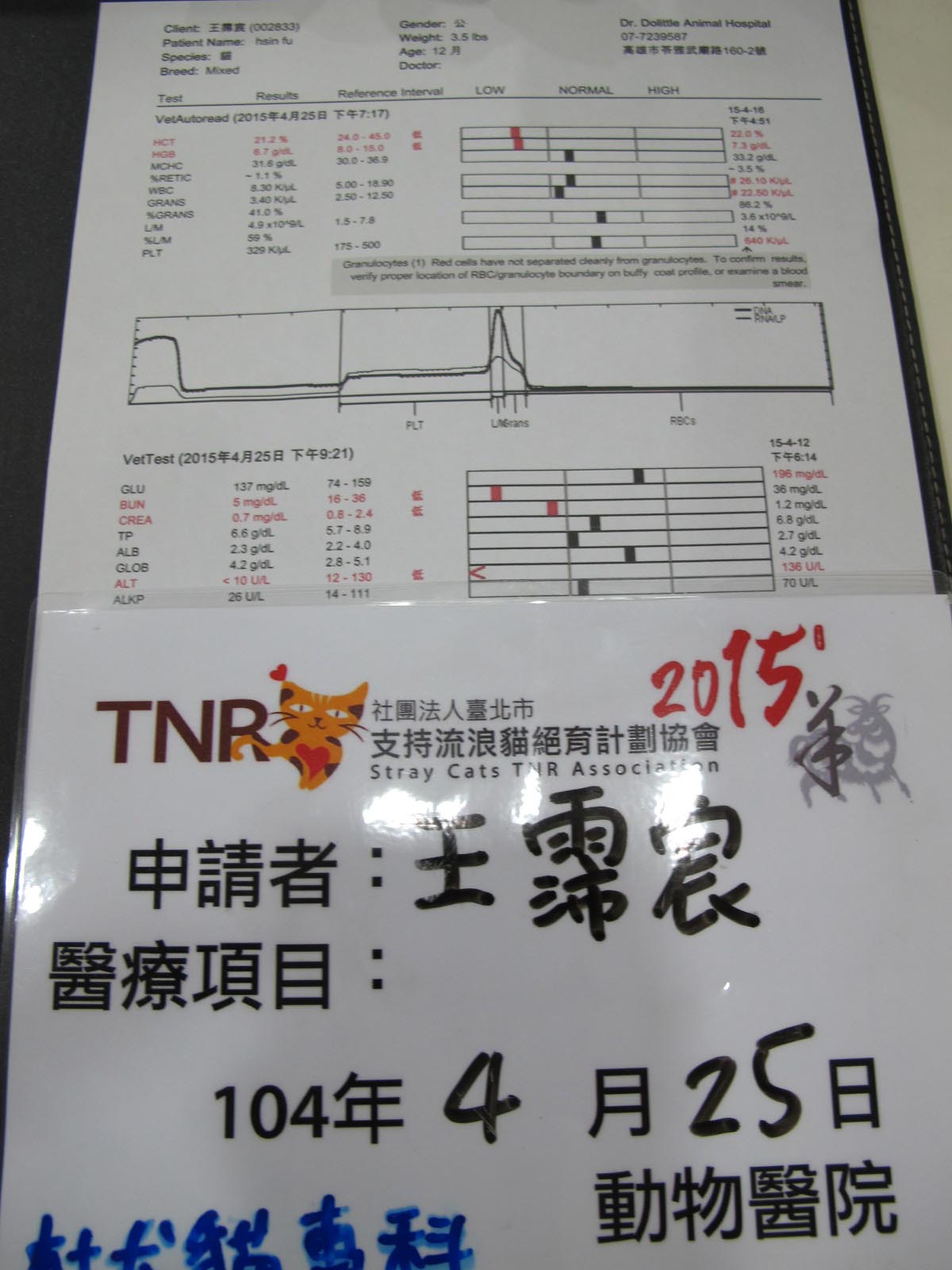 4/12~4/20這段時間我們每二天就從鳳山親自去到高雄探望幸福,看著牠從生命狀況不穩定,血檢有三項指標過高;傷口發炎;到後來的指標回穩,傷口癒合順利。我們和醫師討論,在幸福穩定的情況下,是否可以為幸福辦理出院,最主要的原因是我們擔心著幸福未來的醫療費用。於是經過醫師的同意在4/20接回照顧,只待換藥時再回診。並待傷口癒合後再和醫師討論牠的腳該如何處理是截肢還是手術固定。至此我們已為這隻浪貓『幸福』已付出了不少精力與醫藥費。這次是第二筆的醫藥費我們付出了將近八千塊費用。動物近況說明: 4/20~4/24這段時間幸福並不太進食,雖然仍有排尿與排便,但我們還是很擔心牠的狀況。由於約定的換藥時間到了,我們帶至杜專科那裡才發現幸福正在發燒,且傷口又發炎了。