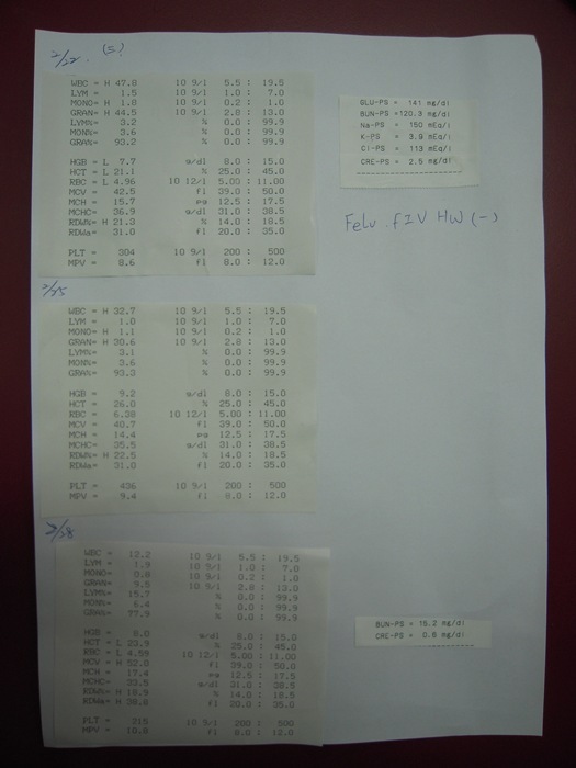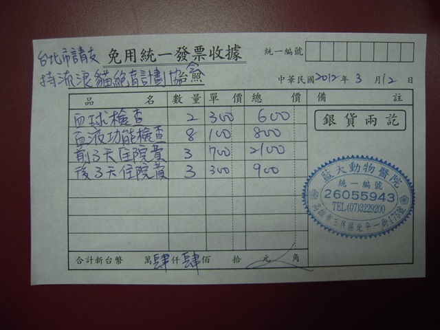 主題: 脫水虎斑 申請者姓名: Vivi Sung 花色: 申請日期: 2012-03-08 17:12:42 申請者部落格: 申請者臉書網址: 所在縣市/合作醫院: 高雄市/藍天動物醫院 治療費用: 4400元 需求人數: 5人 已結案 (2012-03-14 16:00:00) 報名人員: Terry Kuo(已付款)、Sunny Chen(已付款)、Terry Kuo(已付款)、Terry Kuo(已付款)、Lynn Cheng(已付款)、 候補人員: 動物病情說明: 根據愛心媽媽的描述虎班貓本來都會一路跟著她腳邊一直對她撒嬌喵喵叫要食物吃,最近已經四天沒看到牠了,第五天出現時虎斑貓精神不佳窩在一邊,直覺虎班貓生病了,到院時體溫偏低約35度左右,鼻下掛著沾滿塵土的鼻涕,皮膚無彈性約有十%脫水,驗血後發現虎班貓白血球將近五萬,並因脫水導致腎指數上升,經給予抗生素點滴治療後兩天虎斑貓開始會自己吃罐頭,鼻涕減少許多但仍有很大的呼吸聲,給予呼吸道症狀治療的藥物後虎斑貓已回復正常食慾並由愛心媽媽放回原地,第二天後又看到如往常依樣跟在腳邊撒嬌的虎班貓出來吃飯了。