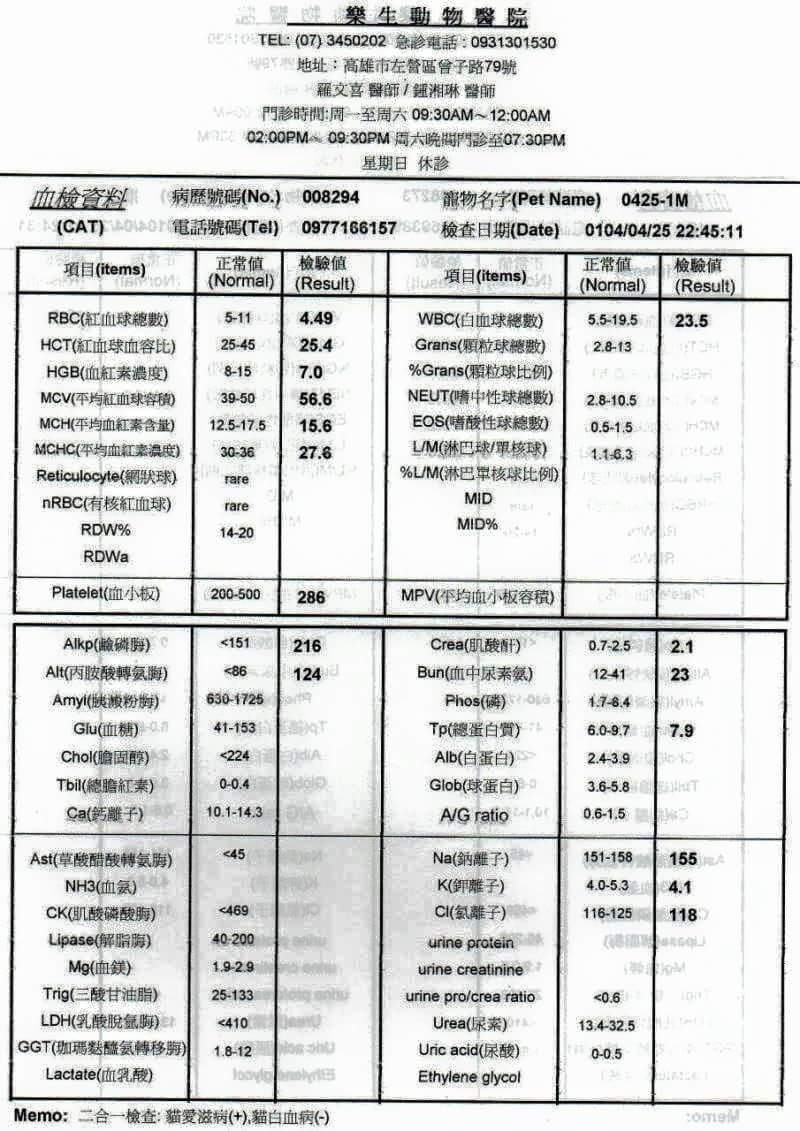 寶貝檢查有,脫水,左眼下有外傷,雙眼有結膜炎且有打噴嚏的現象,口腔檢查發現有口炎及齒炎需洗牙及拔牙,另血檢發現有貓愛滋, 輕微貧血及白血球偏高,腎指數正常但肝指數稍高,鎮定清創後,初步先輸液及藥物治療,待確定其狀況穩定再麻醉洗牙及拔牙,寶貝未結紮一併請醫生傷口好點,順便結紮,醫療費用如下: