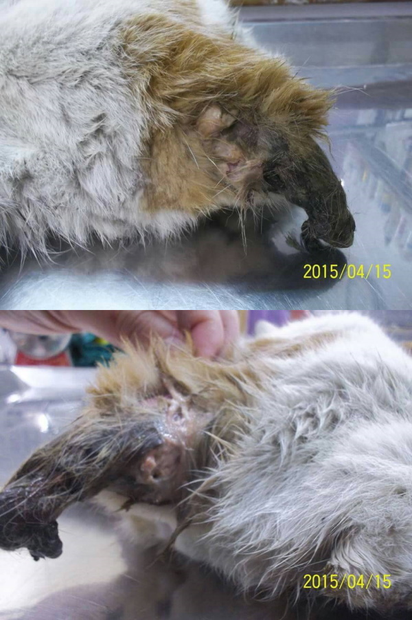 主題: 尾巴潰爛壞死,截尾手術後癒合不佳的親人小貓 申請者姓名: Kelly Ko 花色: 申請日期: 2015-05-14 13:08:29 申請者部落格: 申請者臉書網址: 所在縣市/合作醫院: 彰化縣/成愛動物醫院 治療費用: 16080元 需求人數: 18人 已結案 (2022-03-11 00:08:15) 報名人員: Wendy x2(已付款)、Tsai Dobbie(已付款)、劉盈吟(已付款)、Amy Huang(已付款)、心上人(已付款)、Yenlin Lee(已付款)、豆腐人(已付款)、Fendy x2(已付款)、Momo(已付款)、berry、berry x5(已付款)、Molly Lin、有貓真好 x2(已付款)、 候補人員: 陳筱惠、Kukutyng Yuh、 動物病情說明: 幾天前 聽到附近一陣狗群追逐騷動聲,接著發現每天固定來等吃飯的咪咪似乎有被咬傷,想抓住查看但吃沒幾口很快就跑走躲起來,連找了兩三天都沒消息……直到今天(4月15日)下午 竟然虛弱無力的出現在餵養的地方,尾巴已經呈現爛黑,趕緊抓進籠子送醫院。 動物近況說明: 2015/4/15 傷貓緊急送醫,尾巴已潰爛至尾椎部分,故進行截尾手術。