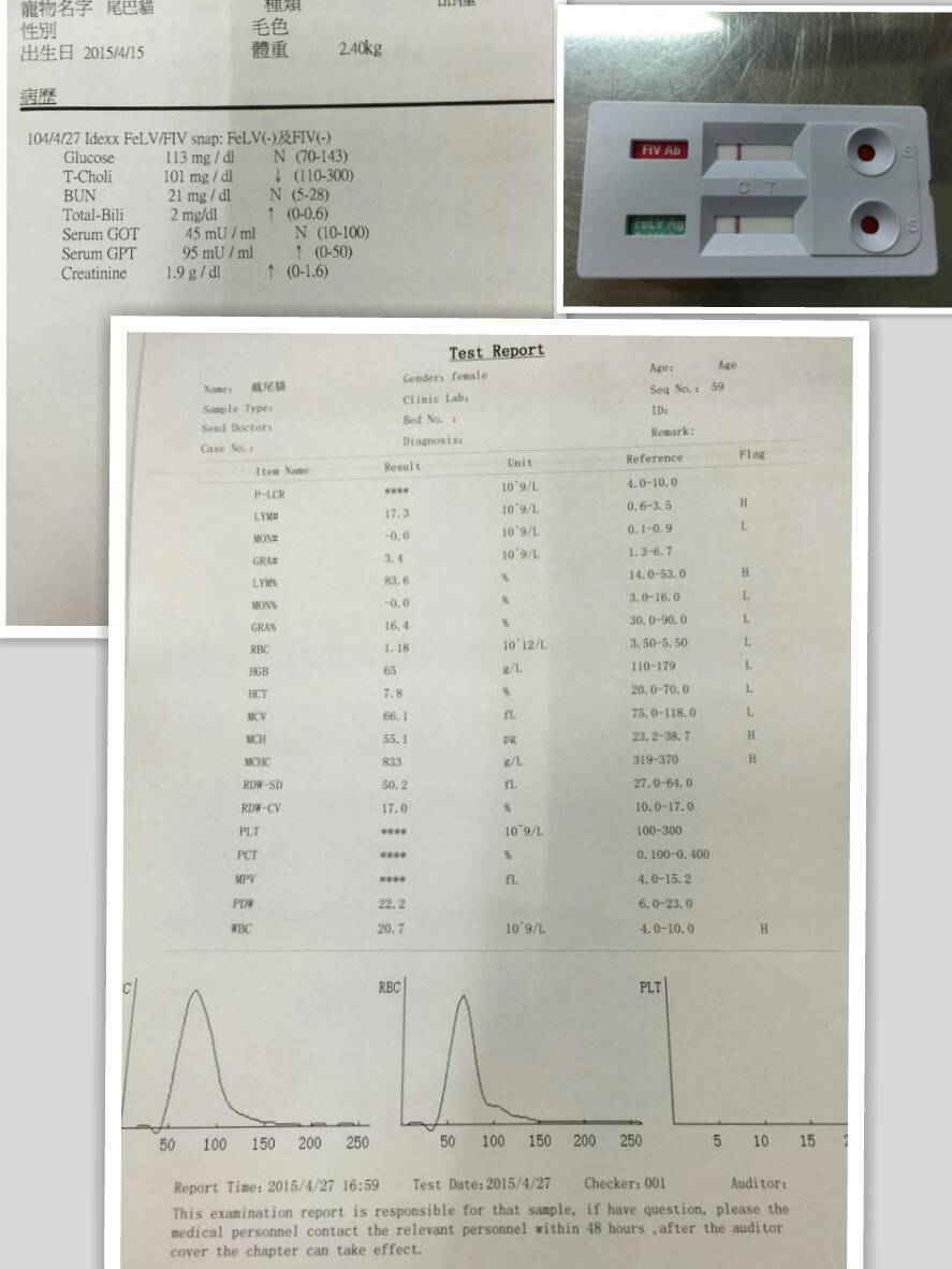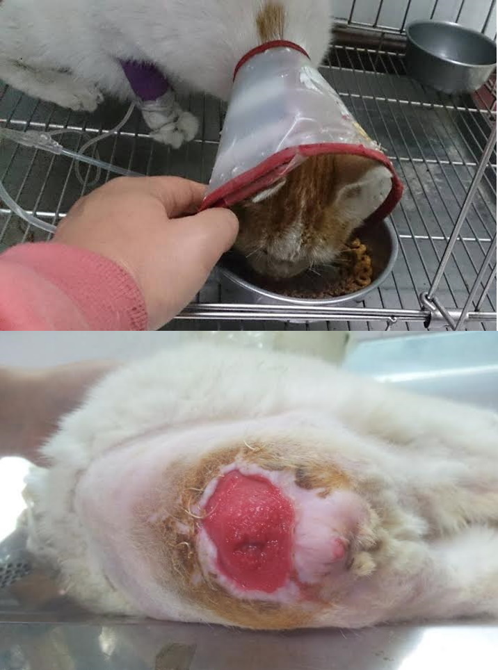 二合一血檢快篩無貓白血及貓愛滋,生化報告沒有貧血、因為有打了長效抗生素,所以白血球指數無異常!。目前就是等傷口周邊收近。醫院沒有植皮技術,只能清創換藥等傷口癒合。