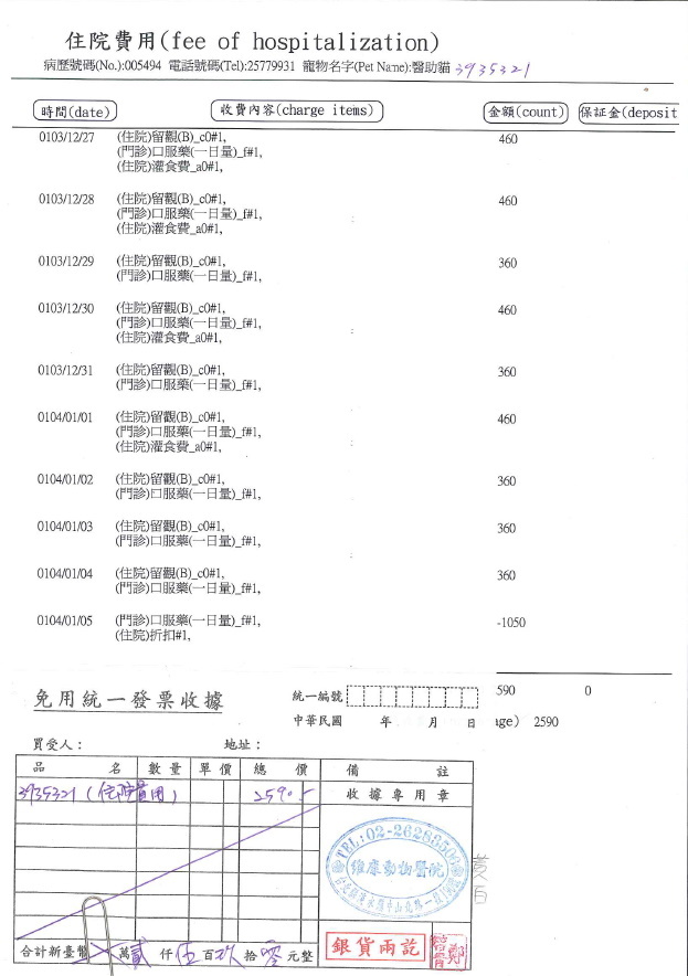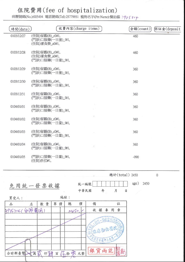 白底虎斑貓咪住院10天醫療費用2450元