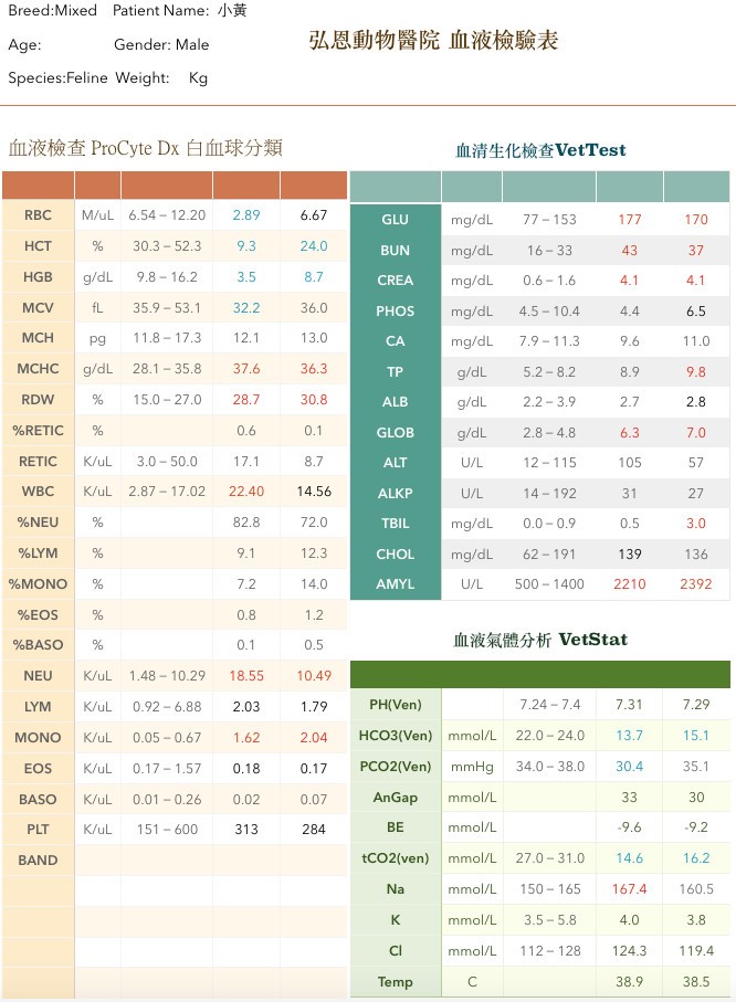 主題: 口腔潰瘍+腎衰竭.脫水.貧血和胰臟炎的愛滋小黃 申請者姓名: 林艾蓁 花色: 申請日期: 2015-05-21 03:17:05 申請者部落格: 申請者臉書網址: 所在縣市/合作醫院: 高雄市/弘恩動物醫院 治療費用: 15900元 需求人數: 17人 已結案 (2022-03-11 00:07:58) 報名人員: imsa(已付款)、磨磨murmur dear x2(已付款)、兔子(已付款)、Carly、YA-CHING(已付款)、YA-CHING x2、YA-CHING x2、KiKi(已付款)、張承歡(已付款)、Haru chen、Haru chen x2(已付款)、黃小米 x2(已付款)、千娌(已付款)、Amber Chung(已付款)、葉靖暄(已付款)、BB(已付款)、lavinia x2(已付款)、 候補人員: 動物病情說明: 小黃是我餵了好多年的街貓,