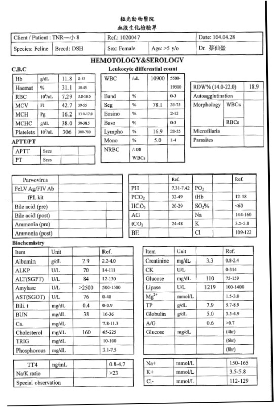 主題: 口炎嚴重的小八 申請者姓名: 臺北市支持流浪貓絕育計劃協會 花色: 申請日期: 2015-05-13 18:17:08 申請者部落格: 申請者臉書網址: 所在縣市/合作醫院: 台北市/極光動物醫院 治療費用: 13311元 需求人數: 15人 已結案 (2022-04-14 17:47:33) 報名人員: Julia Chu(已付款)、Mia Chang(已付款)、周 昊暵(已付款)、謝小伍(已付款)、莊千千(已付款)、伍伍姐 x4(已付款)、Xjizo Lee(已付款)、阿貓(已付款)、周米(已付款)、小美 x3(已付款)、 候補人員: 蔡憶蓁、 動物病情說明: 去年11月小八櫃子上要下來吃飯時一個腳沒踩好摔下來,當場把下排左犬齒撞歪,就醫已無出血情況,X光確認下顎並沒有斷裂但牙齦瘀青,牙齒結石嚴重,但她年紀已大麻醉對腎臟負擔大,若無影響進食暫不需做洗牙等處理,所幸經過一周觀察食慾胃口慢慢恢復,今年四月小八明顯食慾下降,體重從4公斤下降到3.5公斤,血檢腎指數可能因為口炎進食量下降指數偏高,4/29進行麻醉洗牙、拔齒(九顆),住院治療兩天先帶回安養之家照顧,只能吃軟質比較細密的罐頭,至少一周不能吃飼料,只吃軟質食物早晚給予抗生素照顧,醫療費用還請各位幫忙,謝謝!