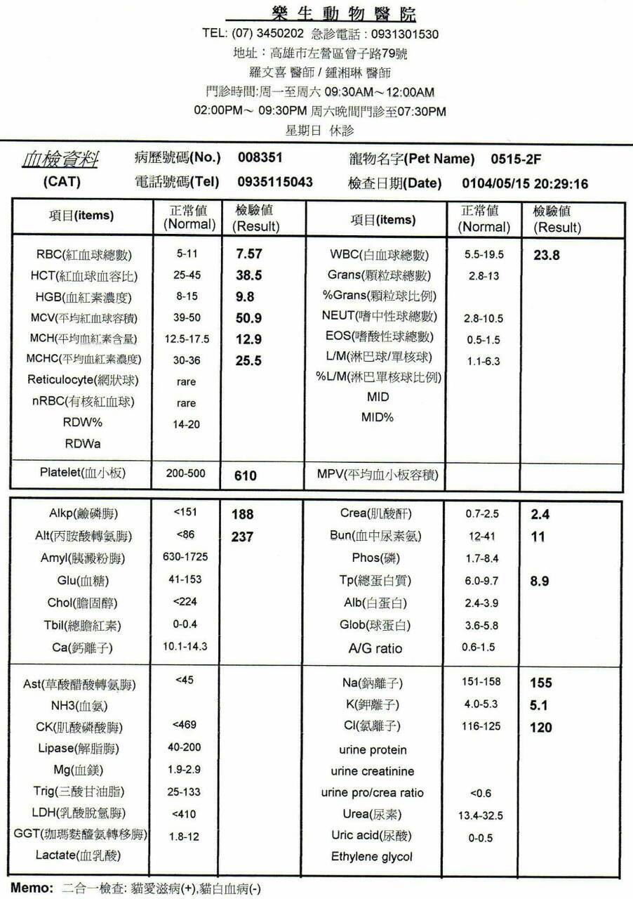 主題: 口水滿身皮膚發炎的貓咪 申請者姓名: 劉素鳳 花色: 申請日期: 2015-06-12 16:26:05 申請者部落格: 申請者臉書網址: 所在縣市/合作醫院: 高雄市/樂生動物醫院 治療費用: 14400元 需求人數: 17人 已結案 (2022-04-14 17:50:01) 報名人員: LovelyBaby(已付款)、Mei Mei Liao(已付款)、momo(已付款)、Jin Lee(已付款)、Gary(已付款)、陳珍妮(已付款)、ShenJang Fann x2(已付款)、Vivi(已付款)、晴天貓咪(已付款)、謝小伍(已付款)、Mingchuan Lee(已付款)、錢快來(已付款)、莊子涵(已付款)、妮妮(已付款)、orange(已付款)、柯小伶(已付款)、 候補人員: 動物病情說明: 鼓山路上的浪貓,不知道為何口水流的全身髒兮兮濕答答,感覺他口腔一定有問題,送到合作醫院檢查,有耳炎,皮膚發炎,脫水,還有鼻分泌物,且有嚴重口炎及齒炎需洗牙及拔牙,另血檢發現有貓愛滋, 白血球過高,肝指數亦有偏高的問題,初步先洗牙拔牙並輸液及藥物治療。