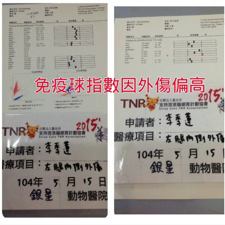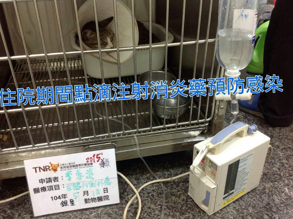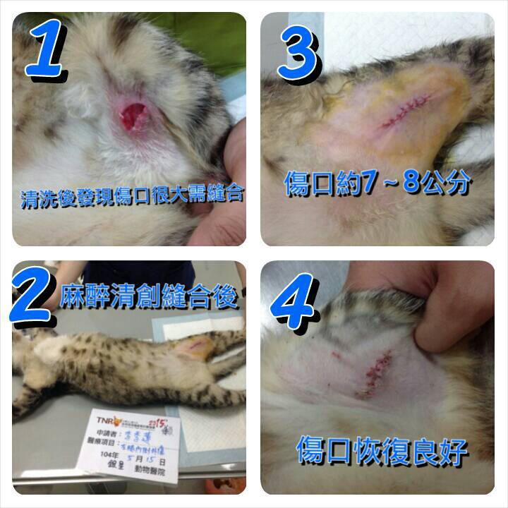 主題: 高雄頂好菜市老浪貓大腿內側外傷清創縫合 申請者姓名: 李季蓮 花色: 申請日期: 2015-05-22 16:09:00 申請者部落格: 申請者臉書網址: gilane1232@gmail.com 所在縣市/合作醫院: 高雄市/銀星動物醫院 治療費用: 5250元 需求人數: 6人 已結案 (2022-04-14 17:49:54) 報名人員: Haru chen x2(已付款)、Anq Liao x2(已付款)、chiawei(已付款)、Jill(已付款)、 候補人員: 動物病情說明: 生活在高雄頂好市場的咪咪是隻約8歲的老浪貓!由我助紮菜市場內水果攤妹妹~阿如負責餵養,咪咪吃飽後會跳上貨車睡覺,阿如生意空檔摸咪咪翻肚時發現左後腳大腿內側一開放性傷口,雖沒流血但有濕黏組織液滲出,趕緊通知我帶咪咪就醫!傷口是1~2天內刮傷呈現不規則約5元硬幣大的皮開撕裂狀,需麻醉將傷口四周不完整皮修減清創再縫合,因咪咪年紀大要做生化血檢評估麻醉風險!幸好咪咪長期有人餵養血檢除了外傷造成免疫球指數稍微偏高其餘皆正常!便進行麻醉清創縫合,預計住院7天後拆線接回,由阿如繼續照顧餵養! 動物近況說明: 咪咪傷口復原良好出院後原放回頂好市場繼續由水果妹妹~阿如餵養照顧!阿如幫媽媽顧攤收入不多,夏天水果容易壞常常滯銷,像阿如這樣有愛心的餵養人,請大家傾囊相助行動支持