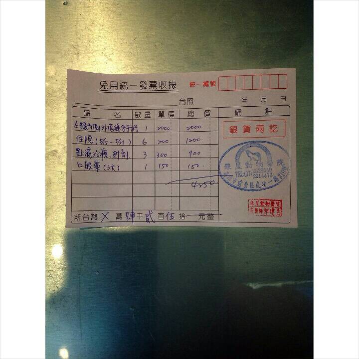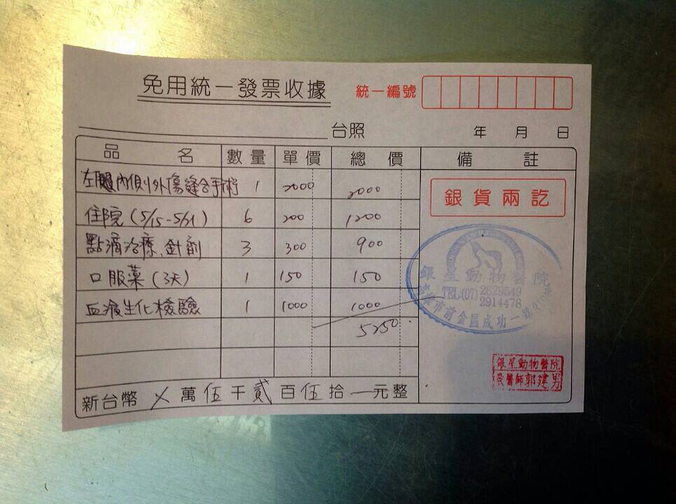備註: 出院當天銀星動物醫院收據少填血檢1000元,發現失誤後立即補上正確收據明細及總金額5250,因此附上二張收據!