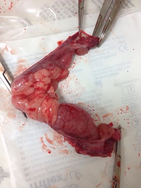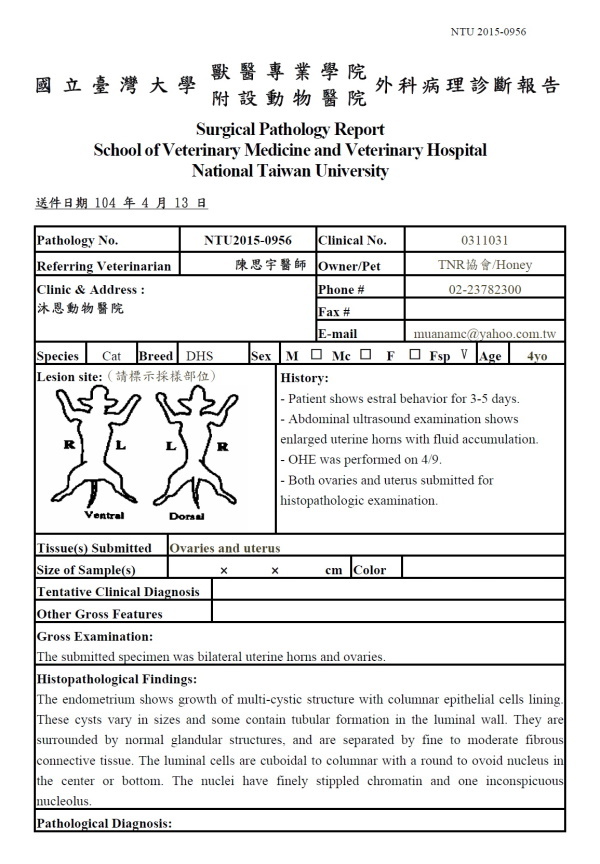 104.4月初HONEY開始出現漏尿的狀況,送醫超音波檢查膀胱無異常但有看到水狀的囊泡在膀胱前面極有可能是子宮卵巢,觀察HONEY對觸摸的反應極像是發情,且有膿樣分泌物,因為HONEY救援後腹部有刀疤縫線,本以為是進行過結紮,沒想到居然是剖腹產的痕跡,因擔憂是子宮蓄膿所以有不明分泌物,血檢後安排手術進行結紮,並送檢驗,子宮病理診斷為子宮角內的囊腫腺瘤,細胞型態屬於良性腫瘤,因子宮卵巢已經移除,住院觀察後已帶回安養之家照顧,十天後回診拆線,現在已經恢復健康,還請各位幫忙醫療費用。