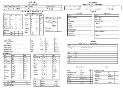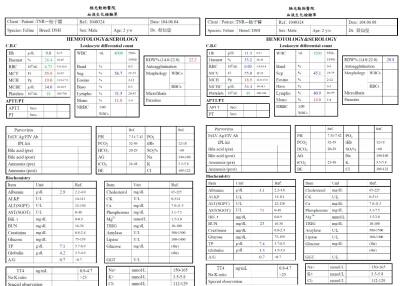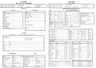 貓咪在台北醫院從5/29~~6/10共住院13天。醫生做了詳細的各項檢查,其中包括多次紅白血球檢測,多次血液生化檢查,目的是希望找出貓咪高燒的真正原因,比較擔心的是白血陽性是由淋巴腫瘤引起的。於6/4在貓咪多處淋巴結進行採樣檢查,了解是否是淋巴腫瘤。結果是排除的。